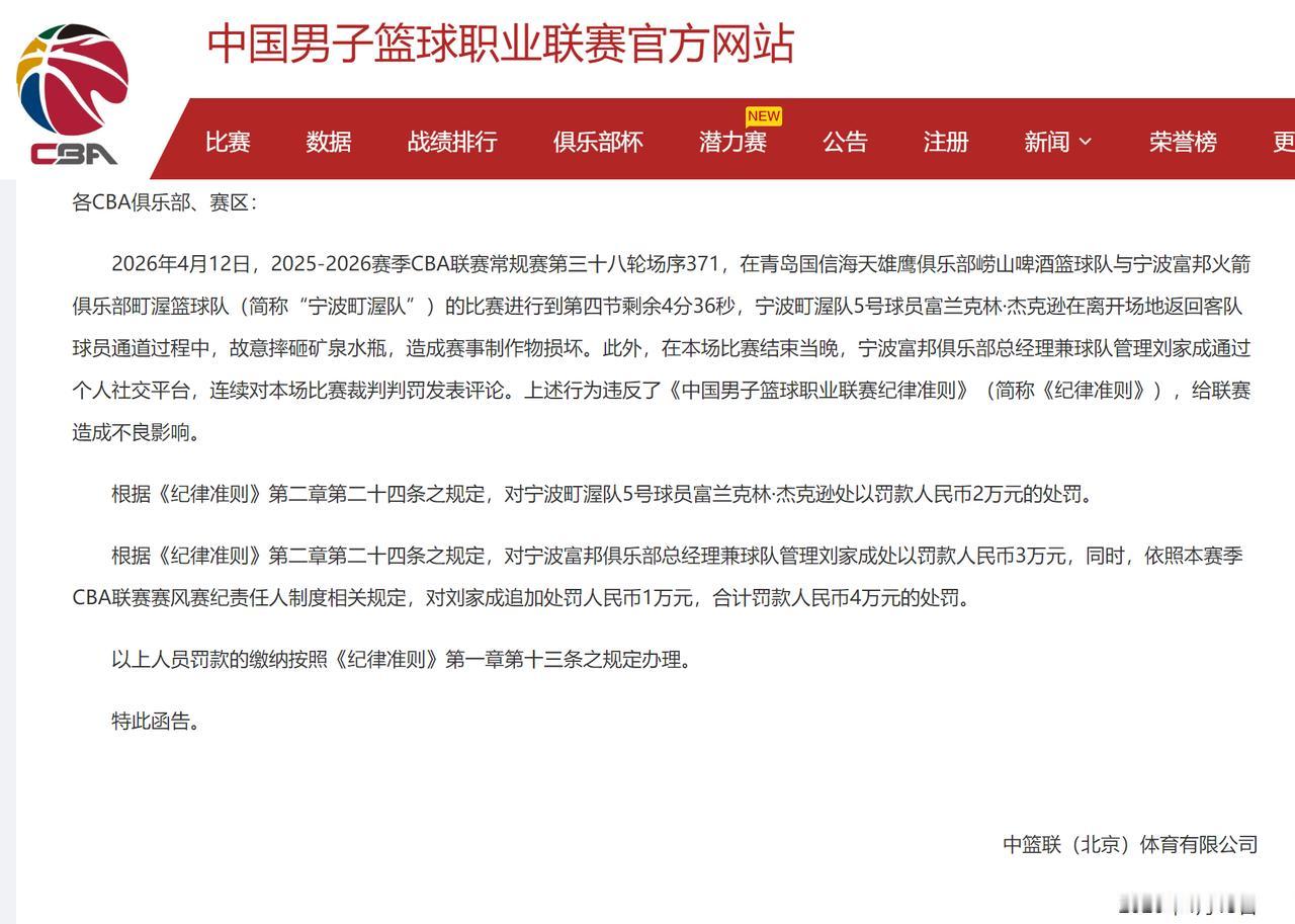 CBA公司给宁波队开出一份大罚单!