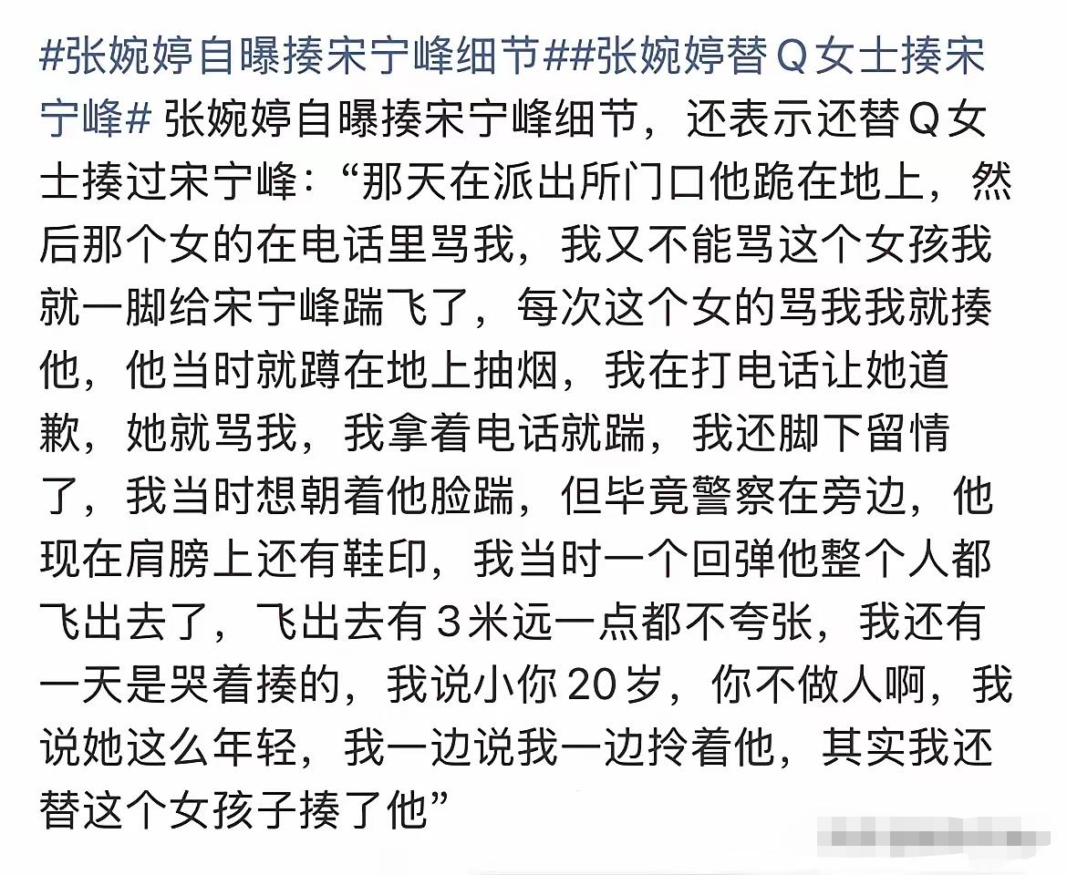 天啊!张婉婷直播说家暴宋宁峰细节,这是能看的吗?就是这个女人能干出来的事。她连带动作语气嚣张头头是道,又是给宋宁峰一脚,又是抓头发,各种细节都暴在直播间里,网友看得好抓马。[震惊]