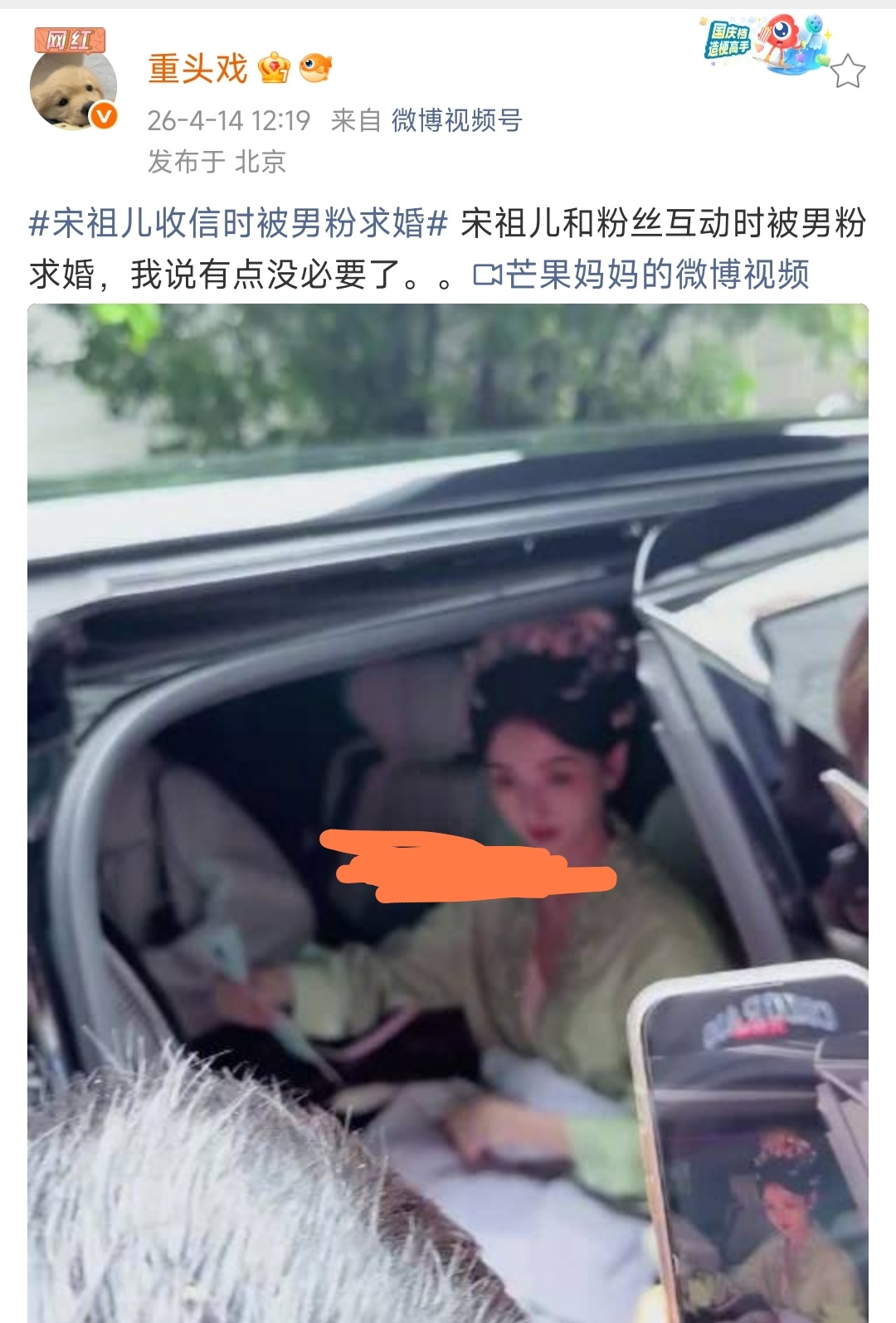 宋祖儿收信时被男粉求婚宋祖儿也太无辜太惨了吧!人家好好坐在车里,连戏服都没换,温