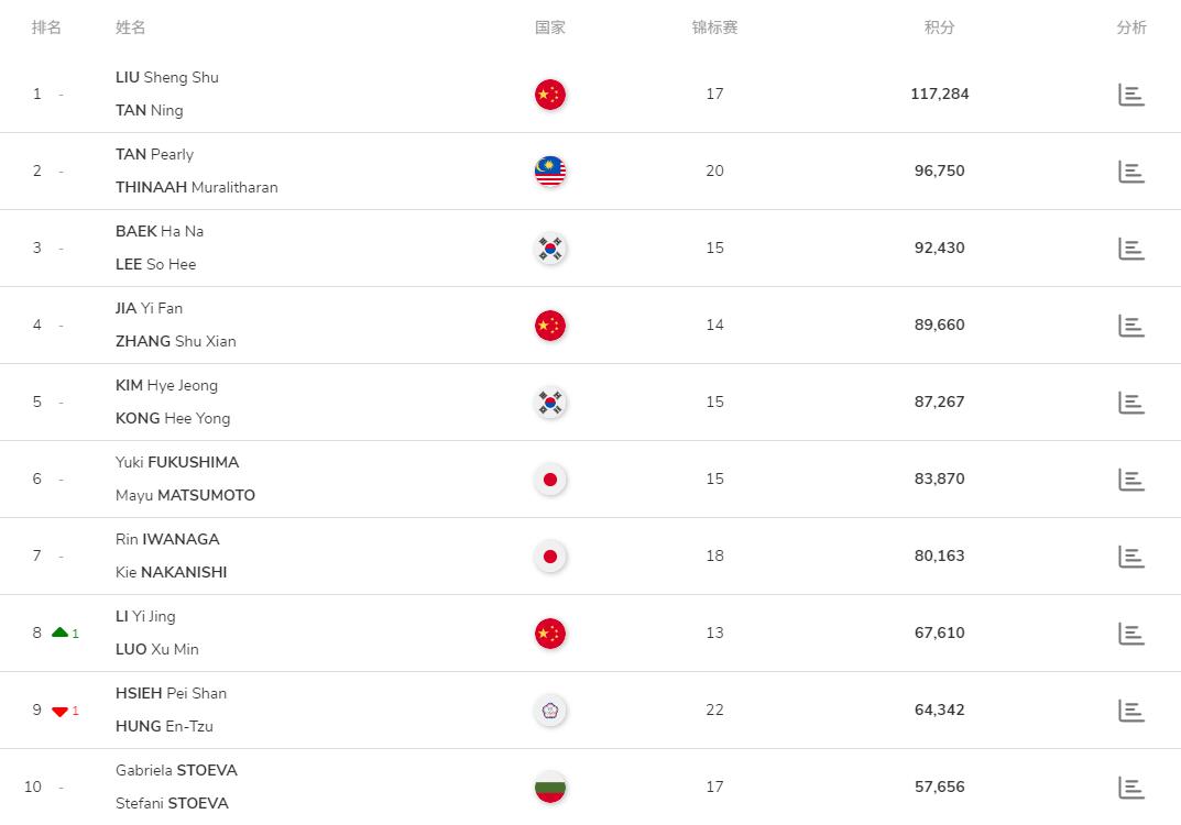 女双:刘圣书/谭宁组合第一,贾一凡/张殊贤第四,李怡婧/罗徐敏第八