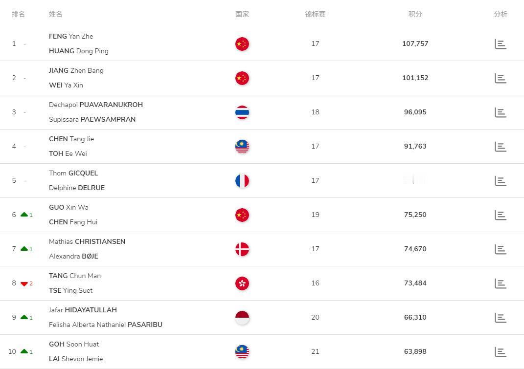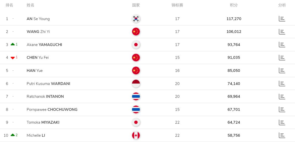 女单:王祉怡第二,陈雨菲第四,韩悦第五