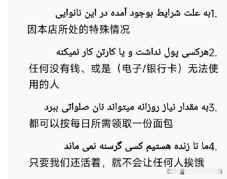 一个月,伊朗有家面包店贴出这样的告示: “由于当前的特殊情况,本店承诺, 任何