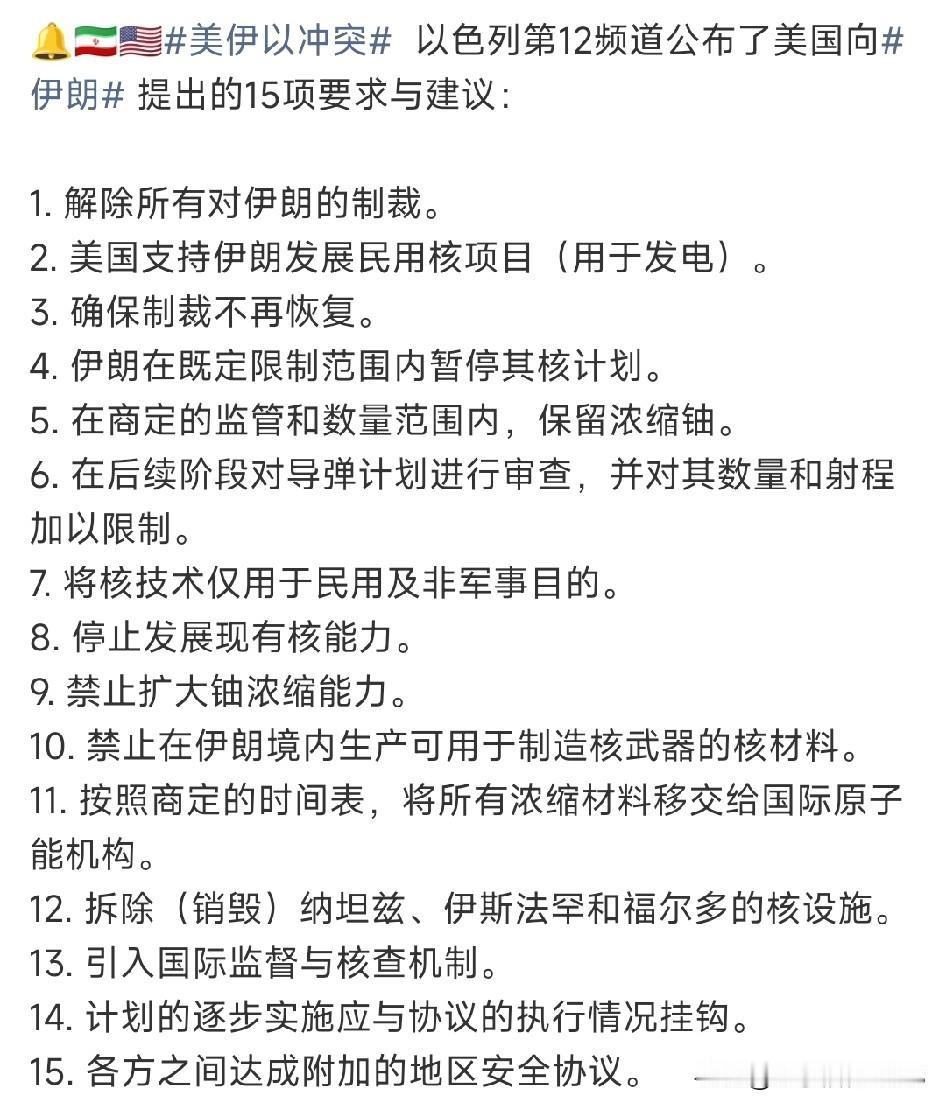 美国对伊朗提的15项停战要求,简直是文理不通,让人摇头叹息。美以伊冲突