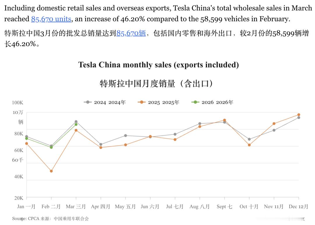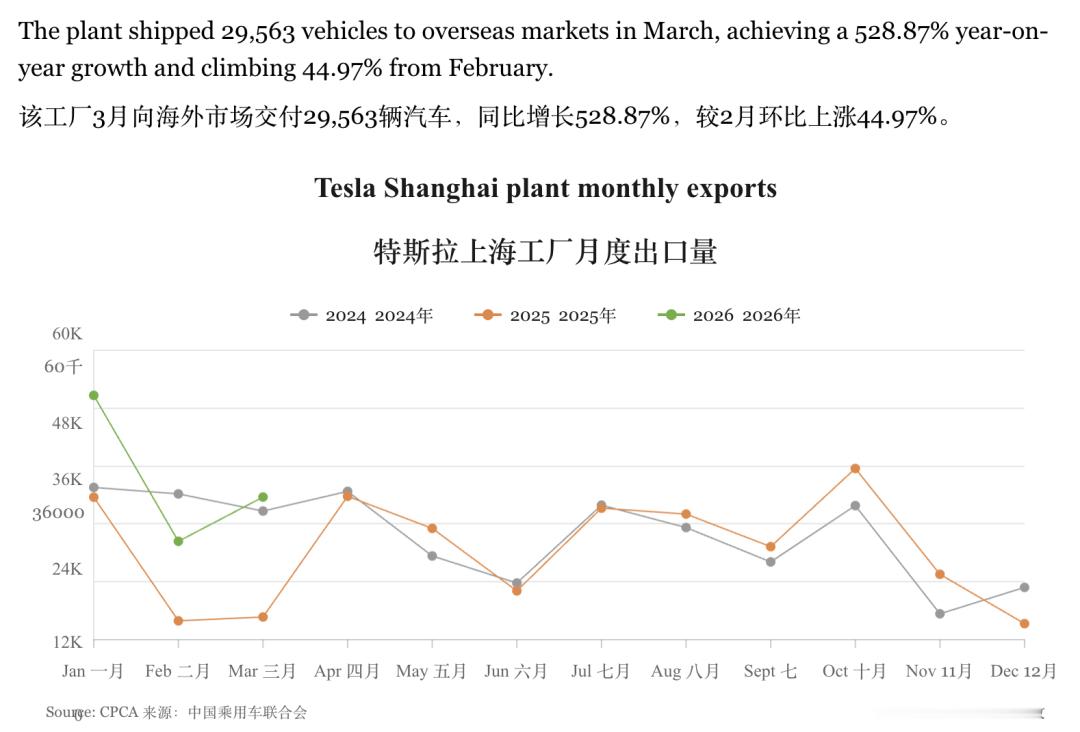 乘联会数据显示,特斯拉上海超级工厂3月出口近3万辆新车,同比大涨528.87%;包括国内销售和出口在内,特斯拉中国3月批发销量超8.5万辆,较2月增长46%。