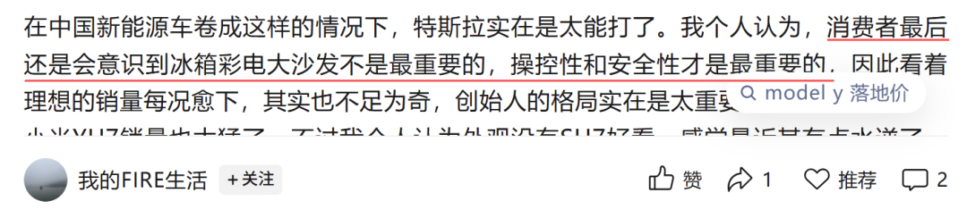 博主“我的FIRE生活”认为,Model Y卖得好,关键在于其技术与用车体验精准戳中了用户的核心诉求,而不是盲目堆配置。