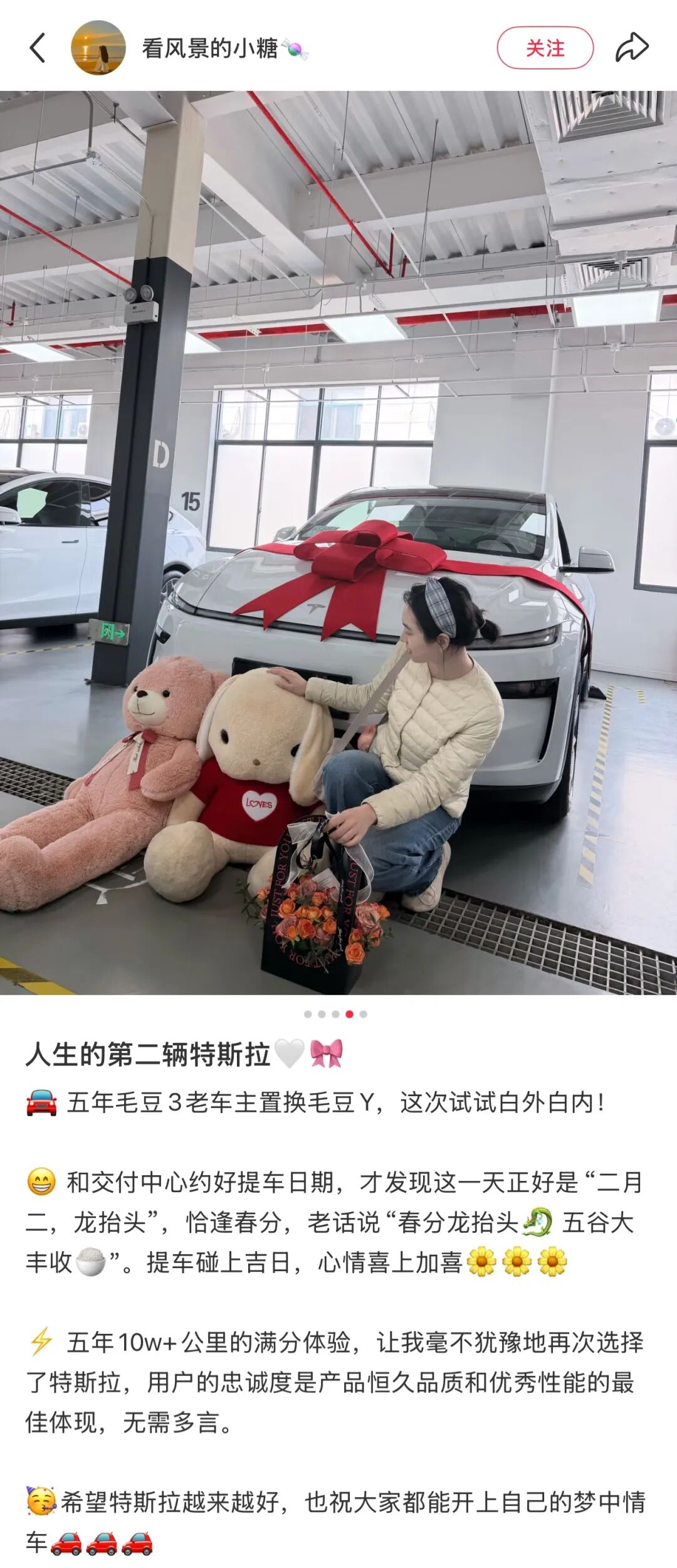 作为拥有五年Model 3驾驶经验的车主“看风景的小糖”分享道:“五年10多万公里的满分体验,让我毫不犹豫地再次选择了置换特斯拉Model Y。用户的忠诚度,正是产品恒久品质和优秀性能的最佳体现。”