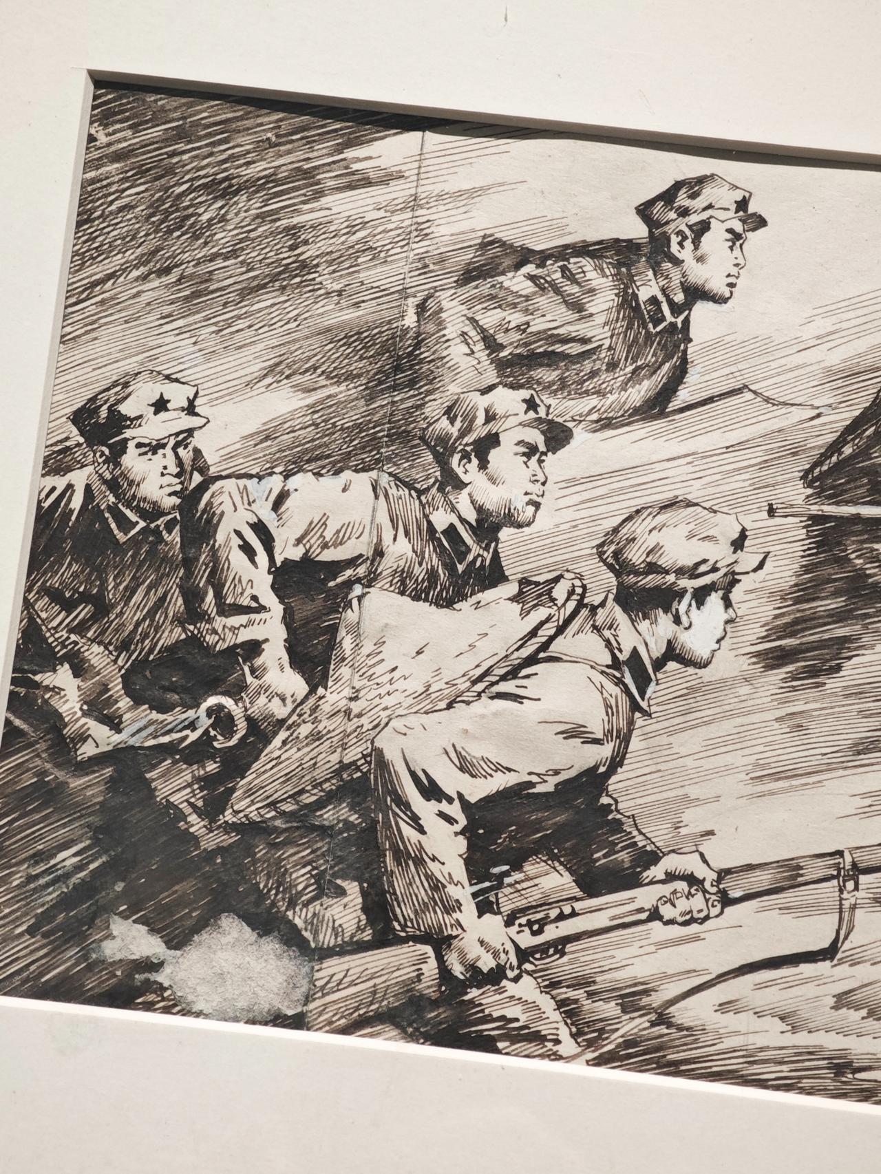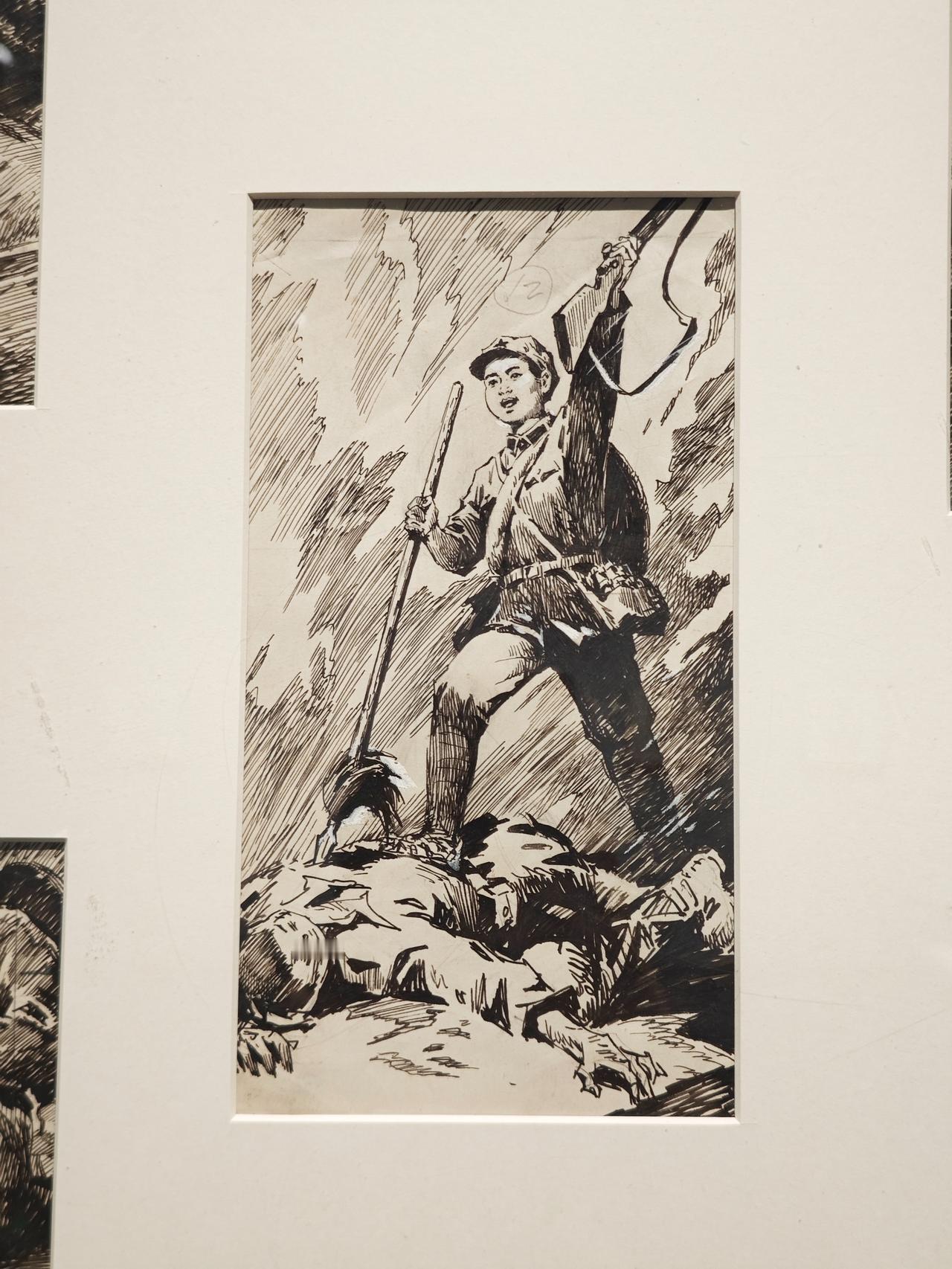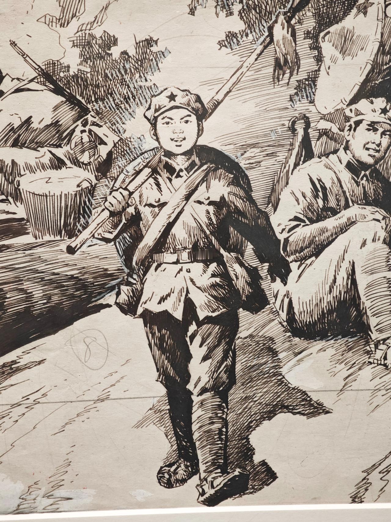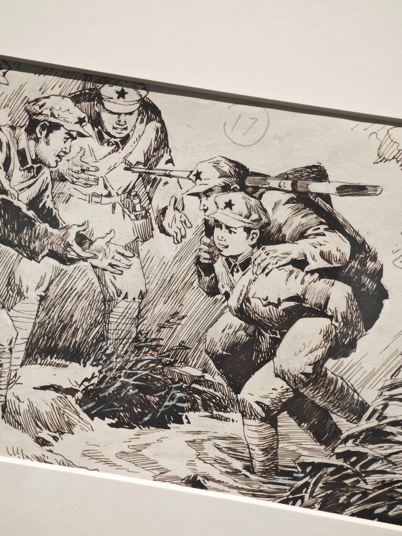 《小红军》连环画故事刊载于1976年《工农兵画报》,钱贵荪运用钢笔线来画,线条严谨而自如,有很强的明暗立体效果,脸部表情丰富生动。大量的排线让战场上激烈紧张的氛围营造出来,表现了钱老深厚的速写功底。
