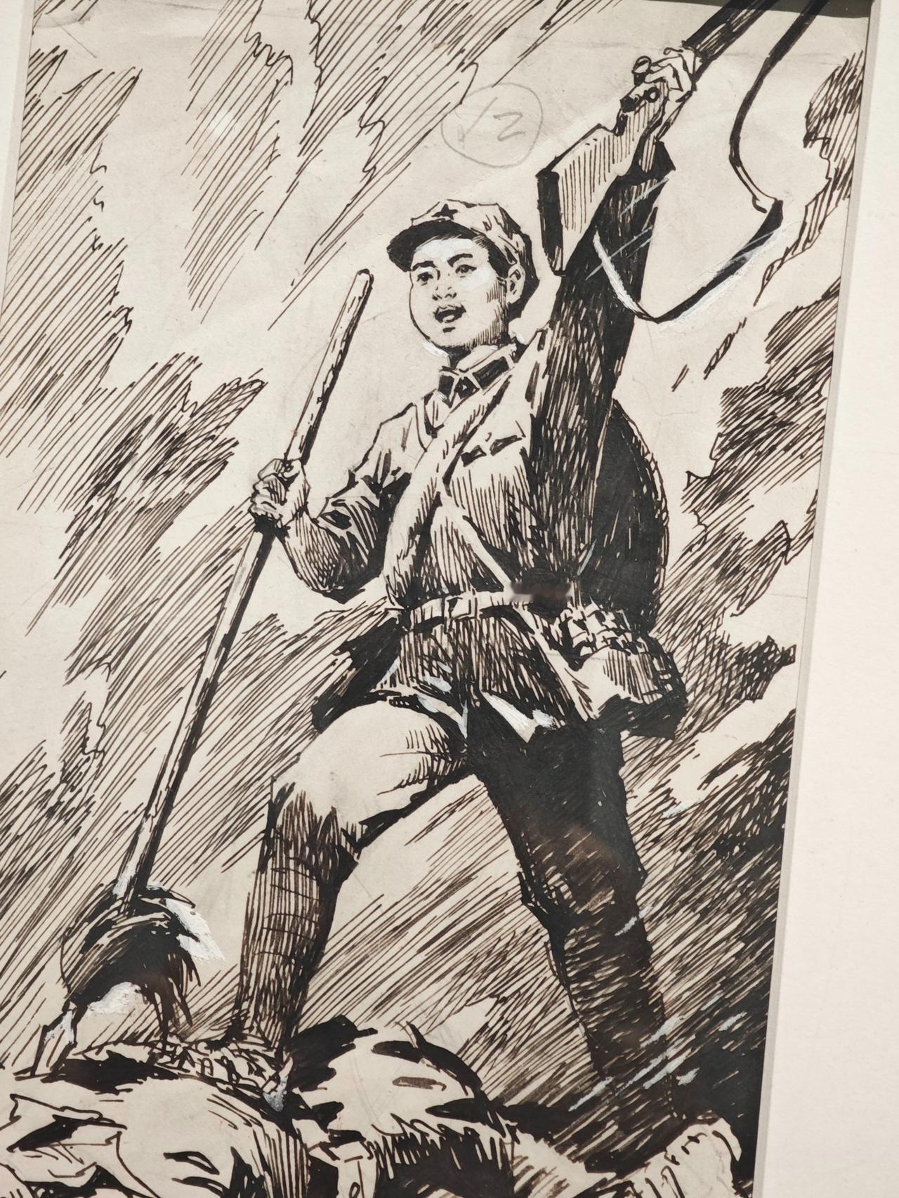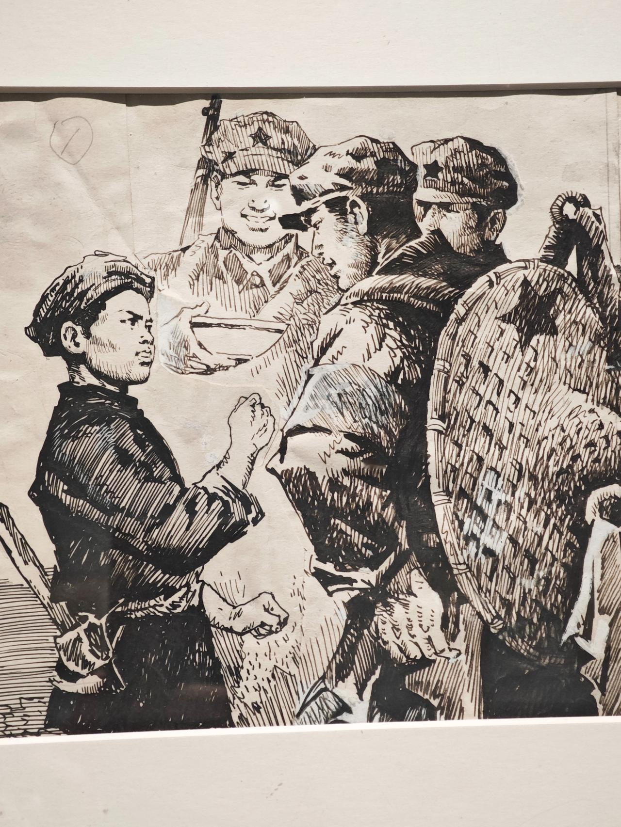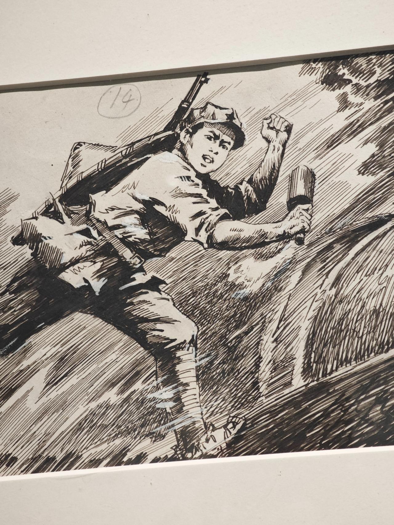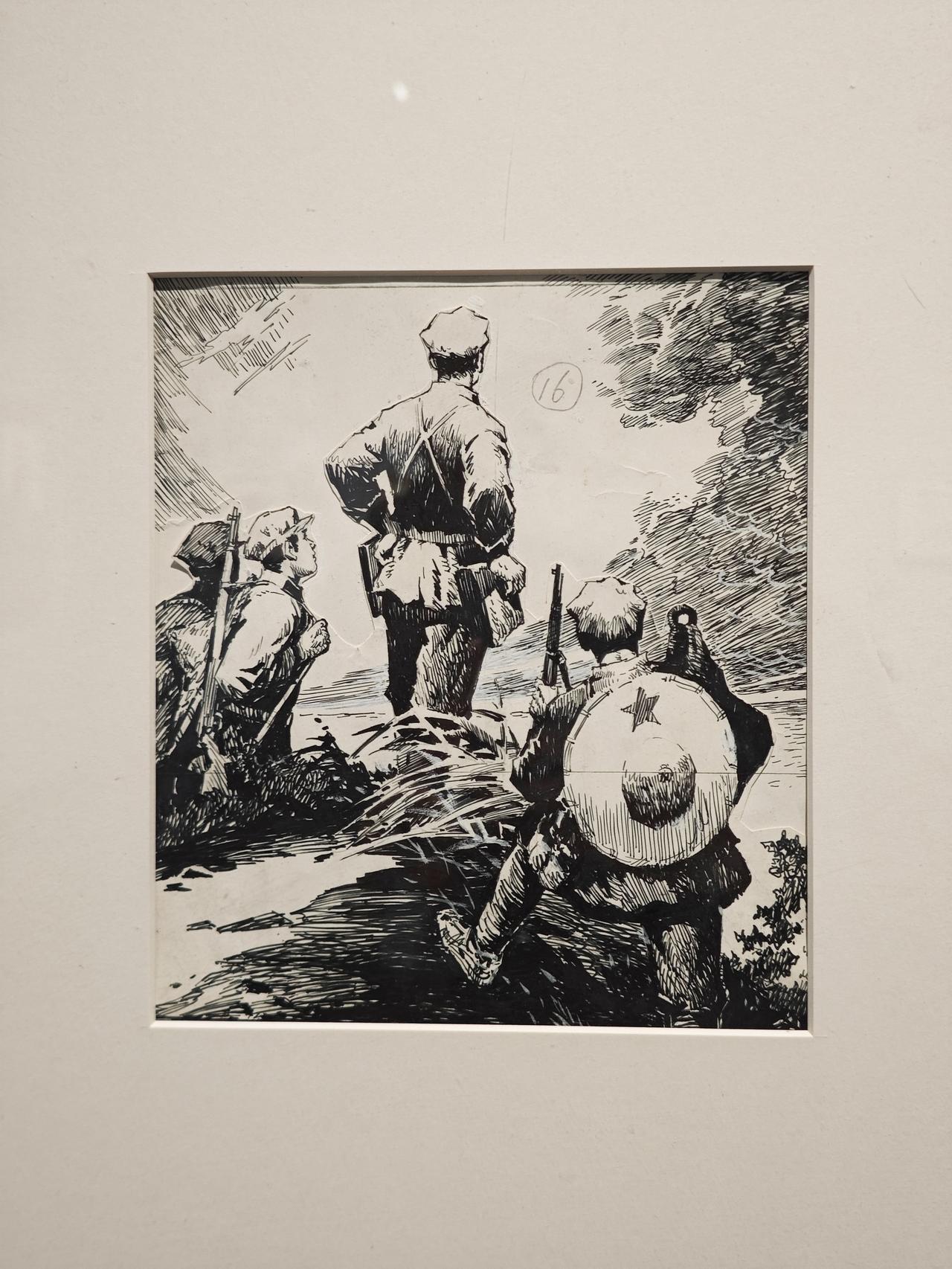 《小红军》连环画故事刊载于1976年《工农兵画报》,钱贵荪运用钢笔线来画,线条严谨而自如,有很强的明暗立体效果,脸部表情丰富生动。大量的排线让战场上激烈紧张的氛围营造出来,表现了钱老深厚的速写功底。