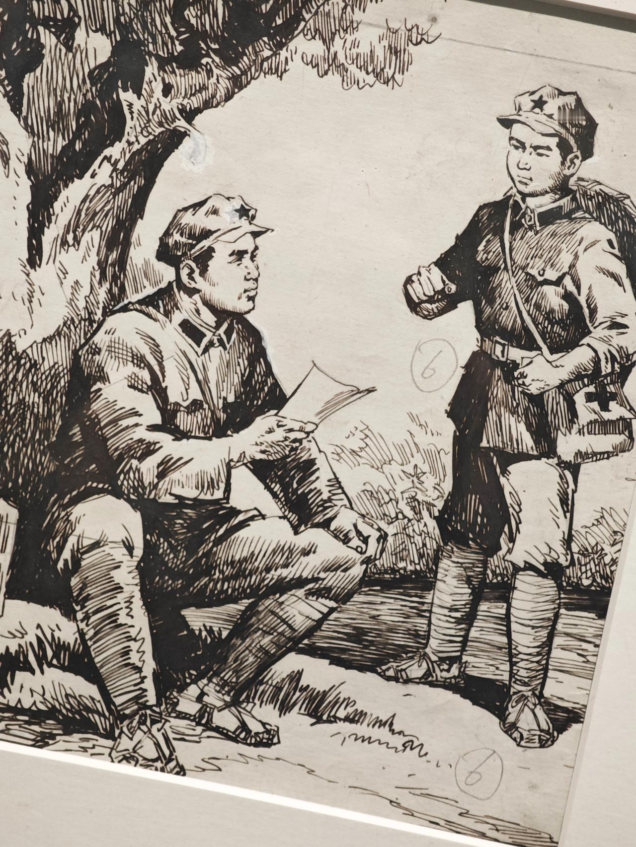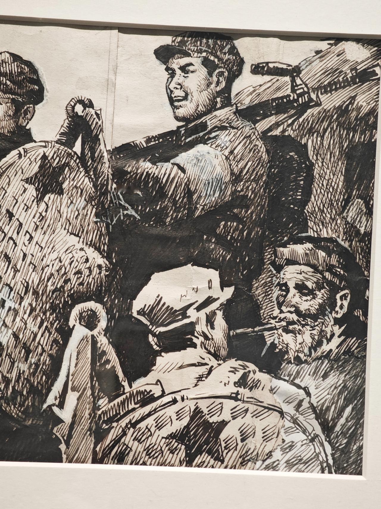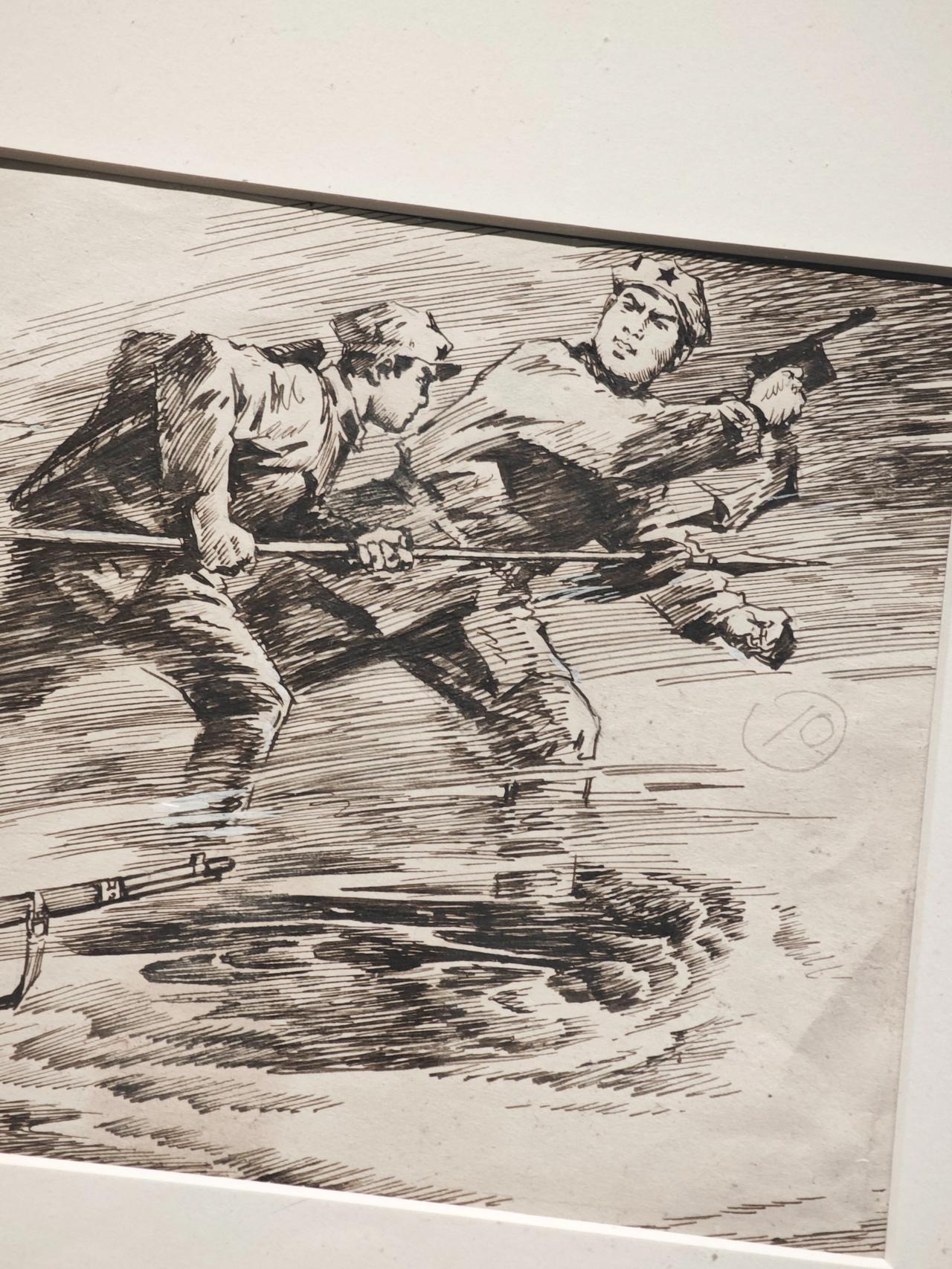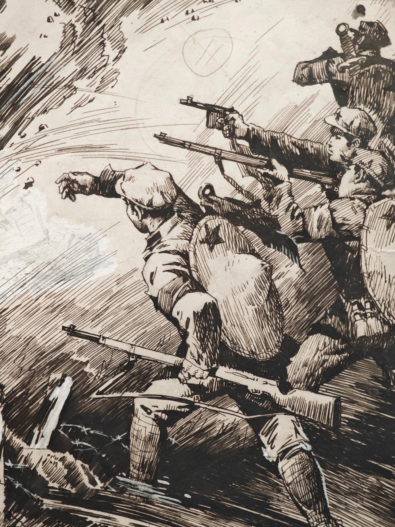 《小红军》连环画故事刊载于1976年《工农兵画报》,钱贵荪运用钢笔线来画,线条严谨而自如,有很强的明暗立体效果,脸部表情丰富生动。大量的排线让战场上激烈紧张的氛围营造出来,表现了钱老深厚的速写功底。