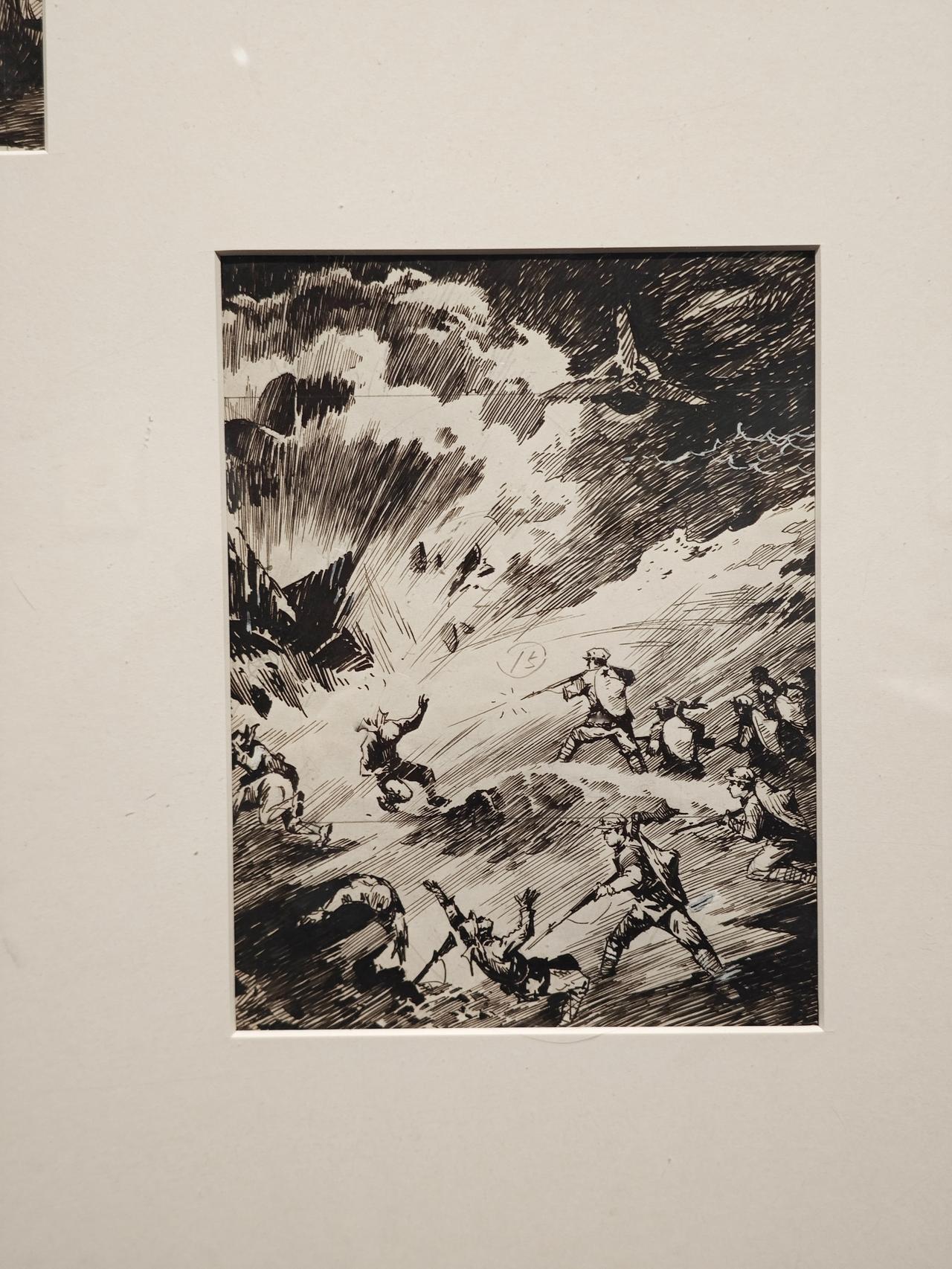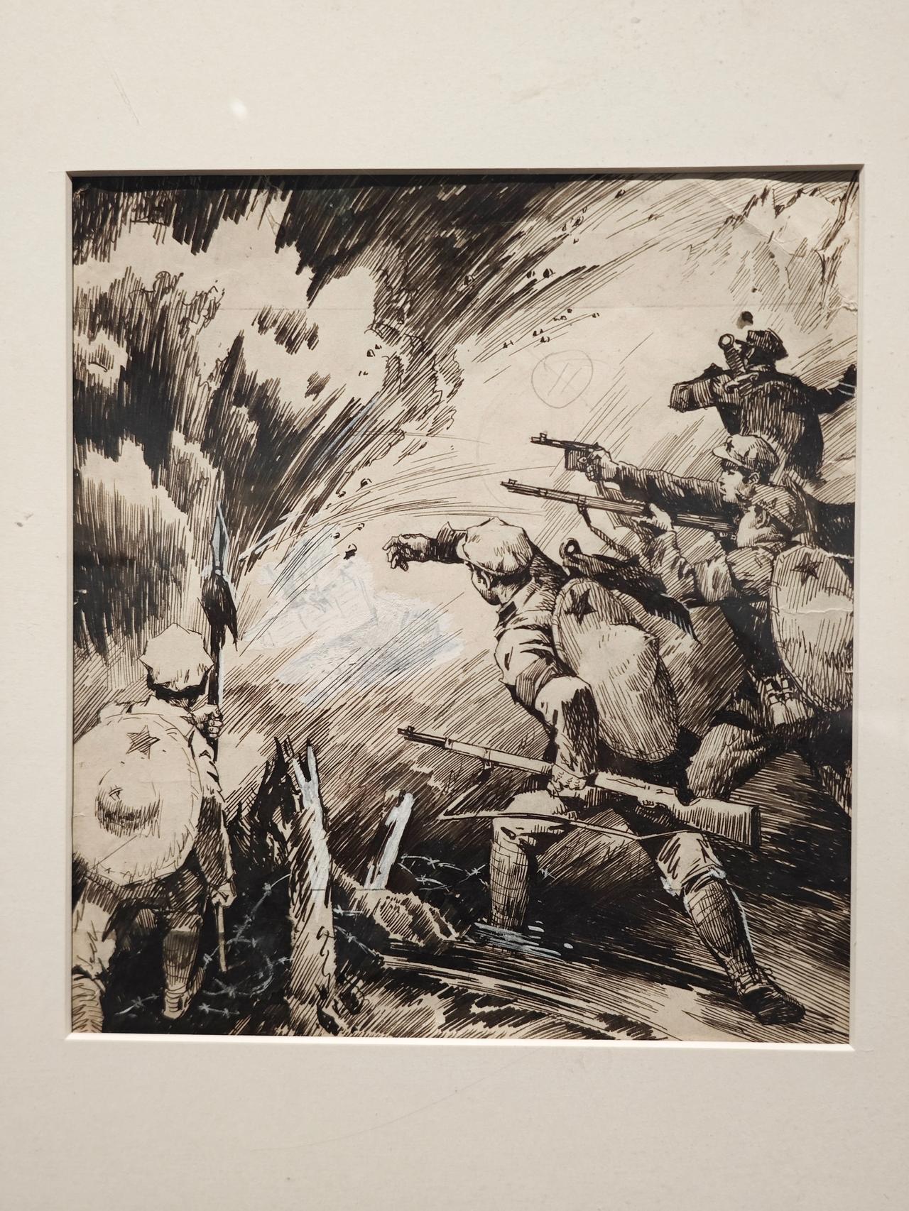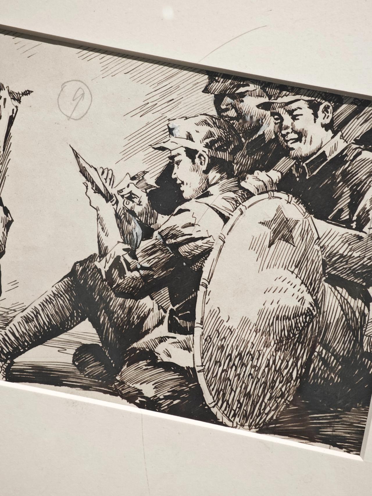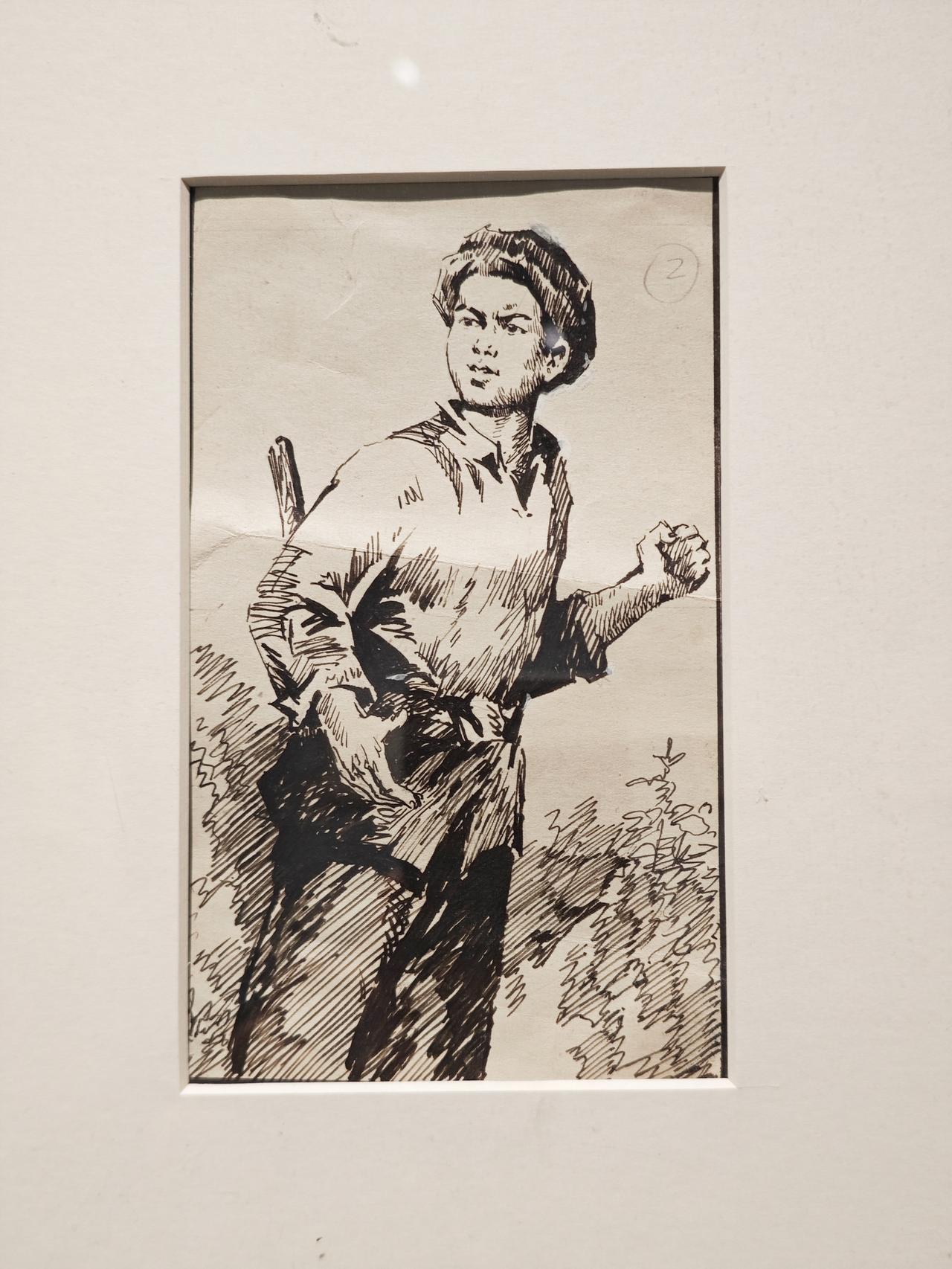 《小红军》连环画故事刊载于1976年《工农兵画报》,钱贵荪运用钢笔线来画,线条严谨而自如,有很强的明暗立体效果,脸部表情丰富生动。大量的排线让战场上激烈紧张的氛围营造出来,表现了钱老深厚的速写功底。