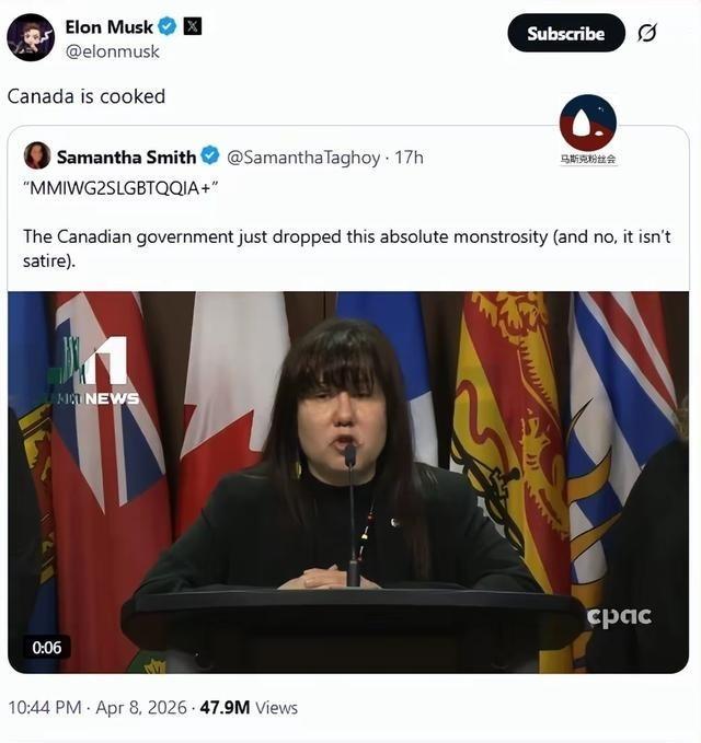马斯克发帖说,加拿大完了。完了完了。 就这么六个字,轻飘飘地从屏幕上弹出来,却在