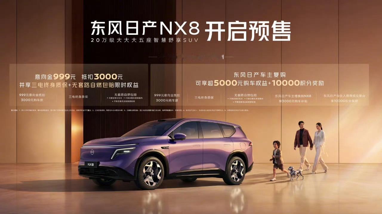 大大大五座NX8售14.99万起东风日产NX8 4 月 8 日,东风日产全新大五座智慧舒享 SUV NX8 正式上市,限时权益价 14.99 万元起,作为 "大大大五座" 标杆车型,它以央企合资大厂的可靠品质,为家庭用户带来颠覆性选择。