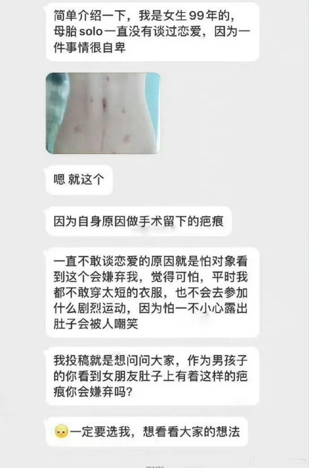 首先这是啥疤?抽脂留下的疤?还是身体做了什么微创留下的疤,得告诉人家让人家知道。