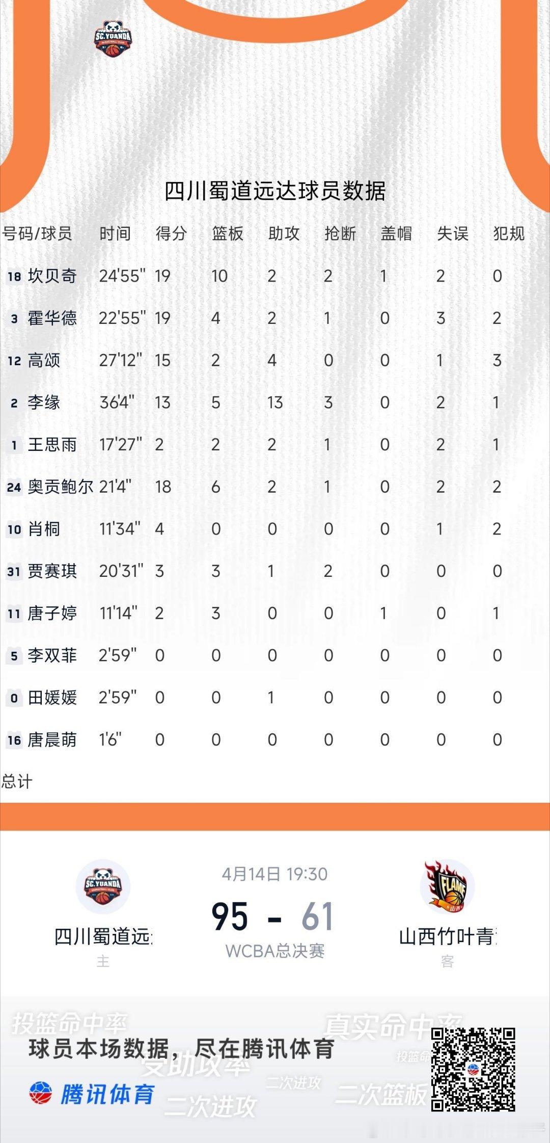 北京时间4月14日,WCBA总决赛,四川蜀道远达95比61大胜山西竹叶青酒。在坎贝奇、霍华德、高颂和李缘等多点开花的带动下,四川第三节打出23比11攻势,在三节结束时把比分拉开到76比47,提前将比赛带入垃圾时间。第四节还剩1分06秒时,外援奥贡鲍尔被吹罚违反体育道德犯规并随即被换下,成为这场一边倒决战中最具争议的一幕。四川女篮vs山西女篮2026wcba总决赛