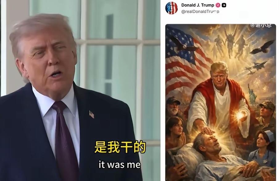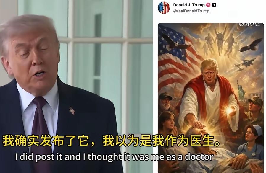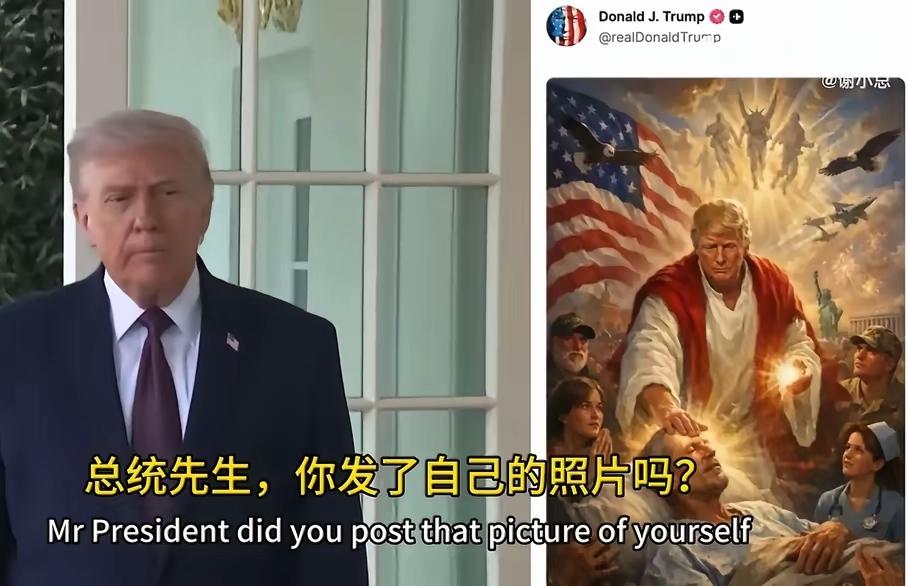 图1是特朗普发的自己化身为耶稣的图片,也承认是自己发的,但当有人问他“总统先生,你发了自己的照片吗?”时,特朗普说他发的是医生,他居然说他发的是“我作为医生”!