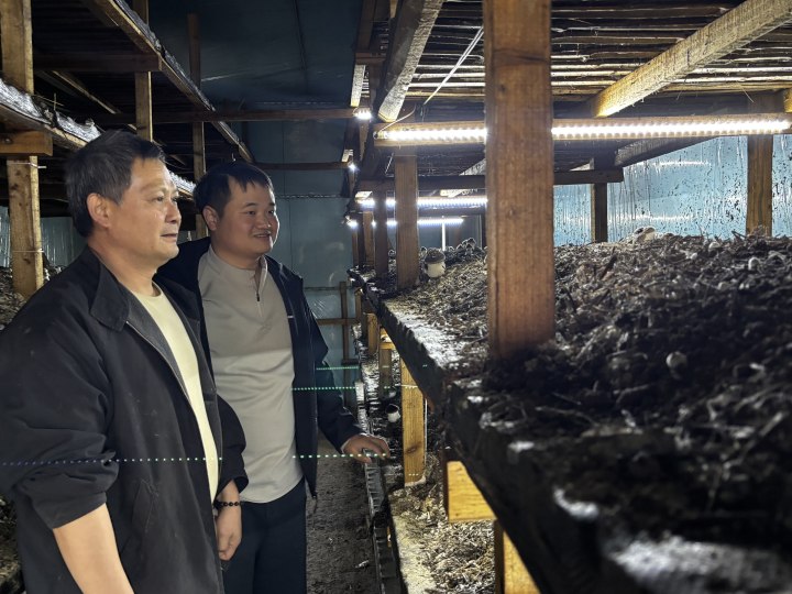 陆甲蹲在菌床边,轻轻托起一朵菌,量了量尺寸。“菌盖到5厘米,就是最佳采摘期了,”他说,“今年头一回试种,每一步都得仔细。”