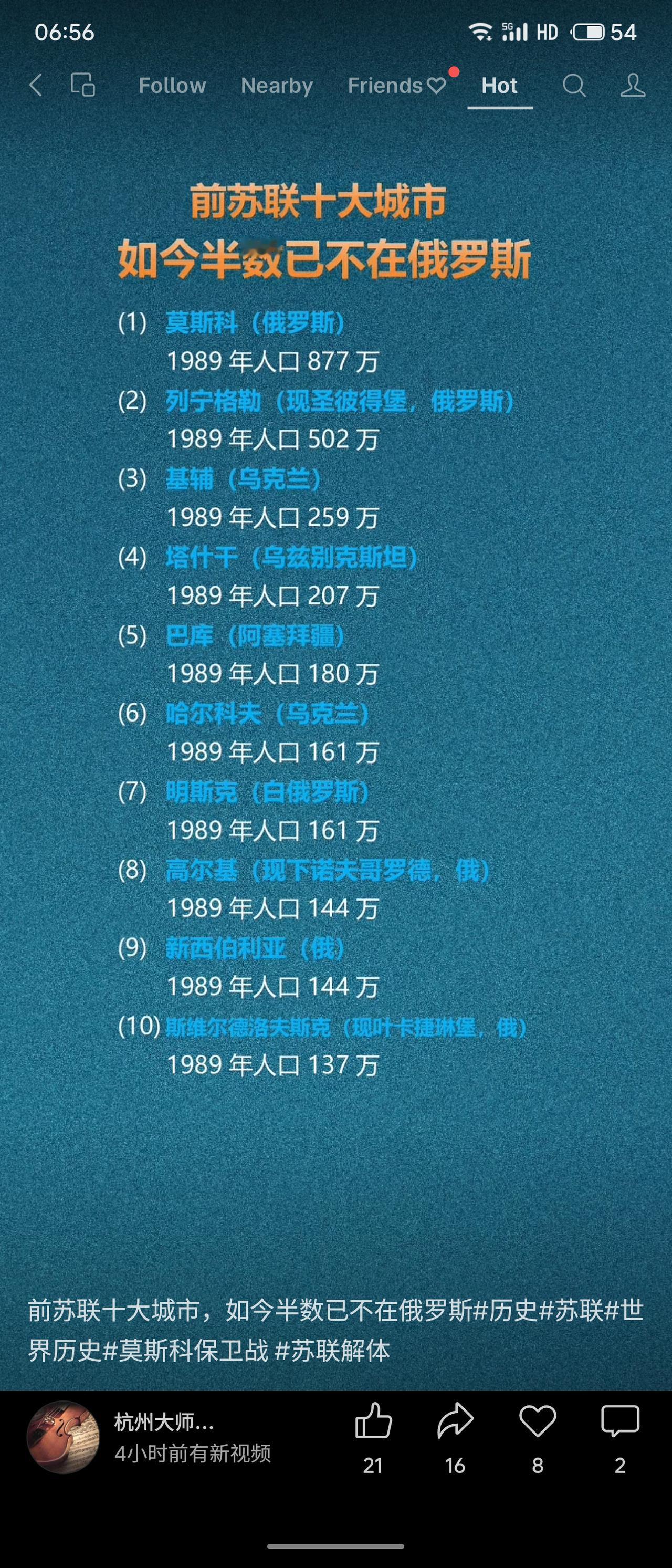 前苏联十大城市中,莫斯科、圣彼得堡等5座仍属俄罗斯,基辅、塔什干、巴库、哈尔科夫、明斯克等5座分属乌克兰、乌兹别克斯坦、阿塞拜疆、白俄罗斯。这一变化折射出苏联解体的地缘重组——曾经的国内中心城市,如今成为独立国家的首都或重镇。人口规模反映了苏联时期工业与行政布局的集中性,而城市归属的变更也持续影响着后苏联空间的政治经济格局,如基辅与哈尔科夫在俄乌冲突中的战略地位。这份名单既是历史缩影,也是现实地缘的注脚。