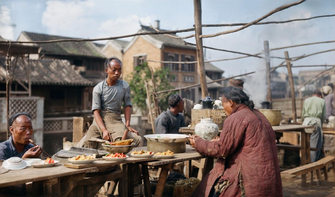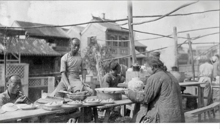 清末,开埠城市街头的小吃摊,没有精致的棚屋,没有花哨的招牌,几张被岁月磨得发亮的长条木桌、长凳,就是这饭摊的全部家当。