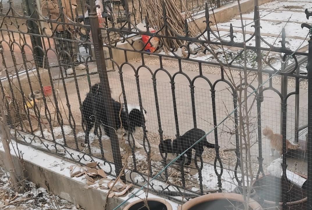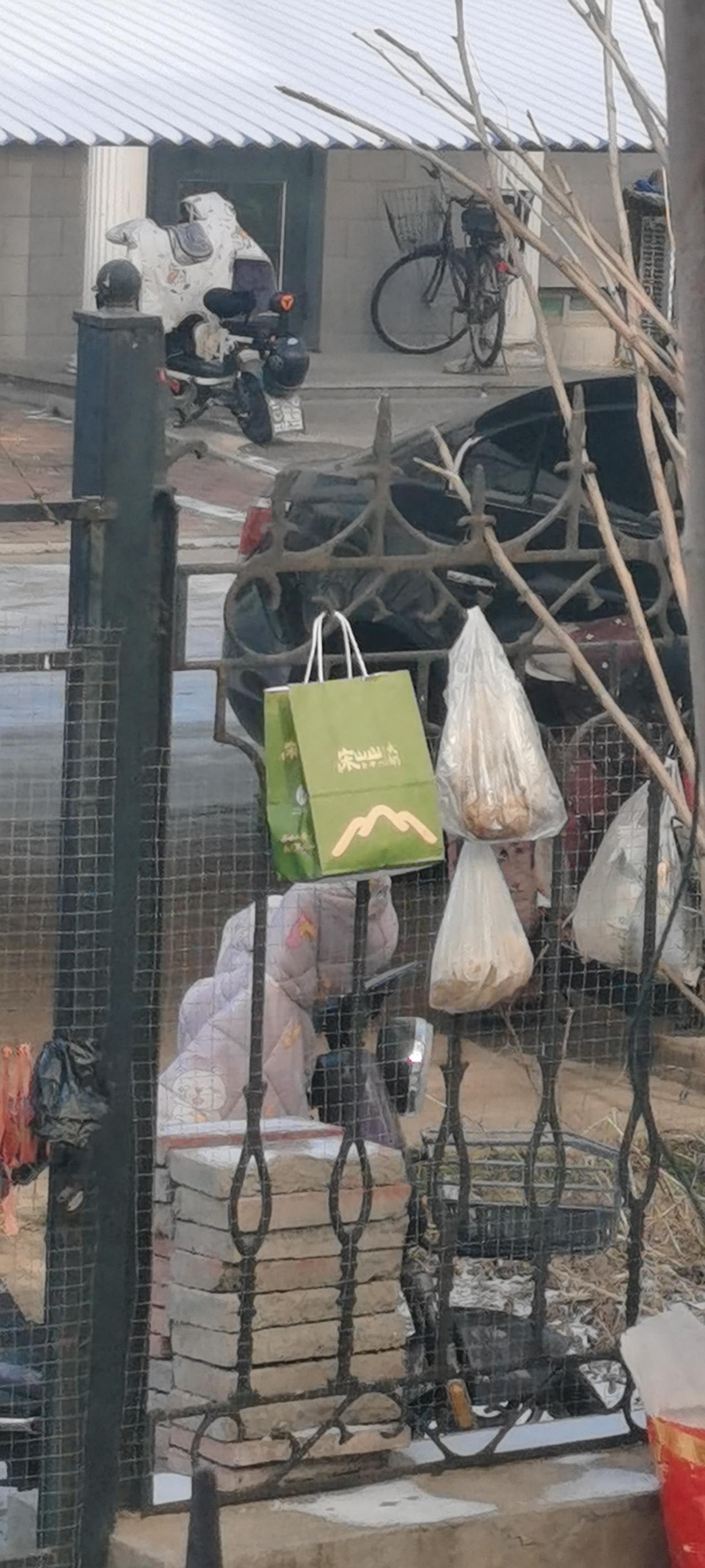 附近的邻居出去吃饭,经常会带回好吃的肉肉和骨头给小黑小黄吃,吃不了的,就挂在门口的栅栏上。