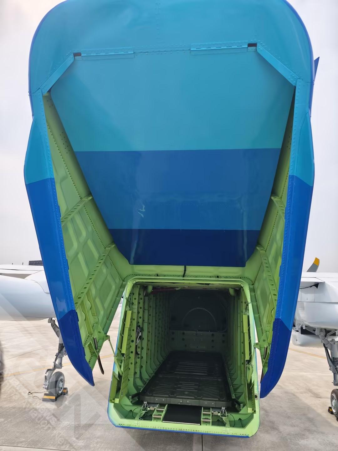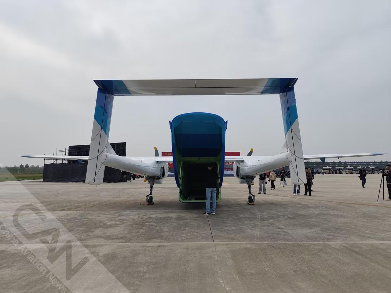 4月15日,HH-200航空商用无人运输系统首飞活动在陕西举办。HH-200采用方形直通机体、双发上单翼、双尾撑设计布局,具有最大商载1.5吨的装载能力。(摄影:李美静 潘力成)