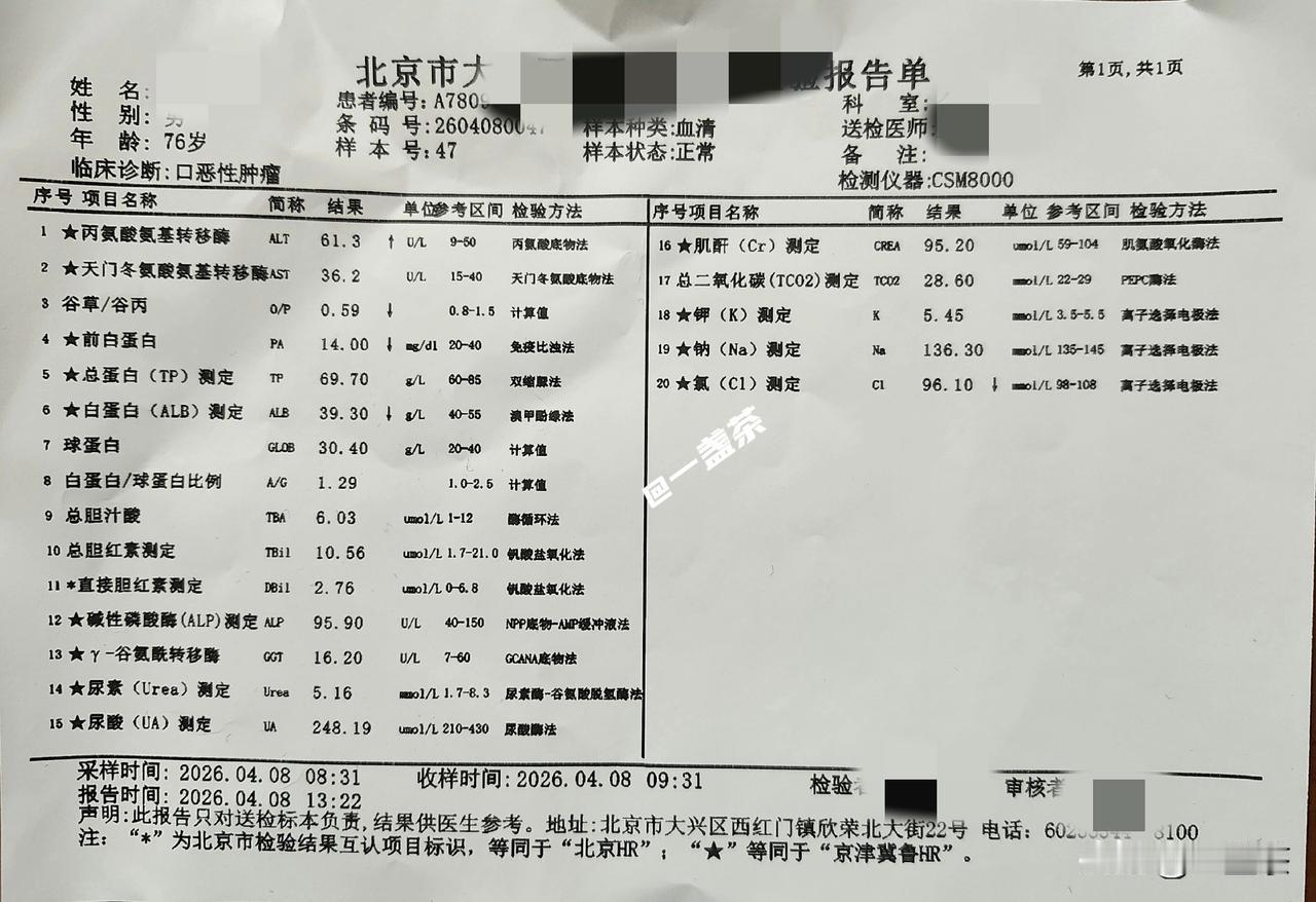 听他这么说我忽然感觉他这辈子给我留下的全是心理阴影和创伤,唯独这一点留下个好的念想,就算他再霸道再不讲理,就冲这点也再耐心伺候他一段时间,让他尽量减少一些痛苦吧。(图片是老头昨天刚取回来的化验结果)