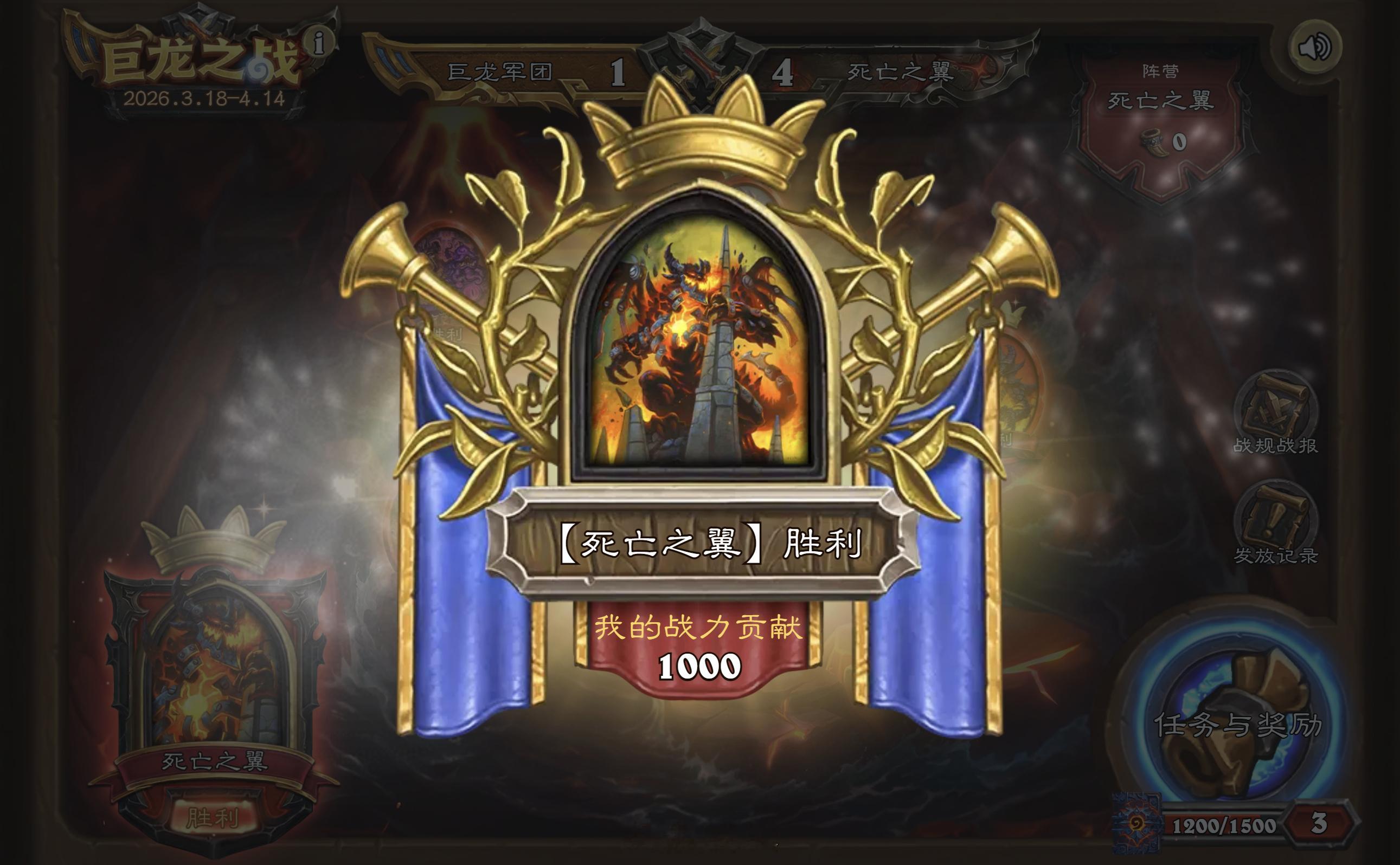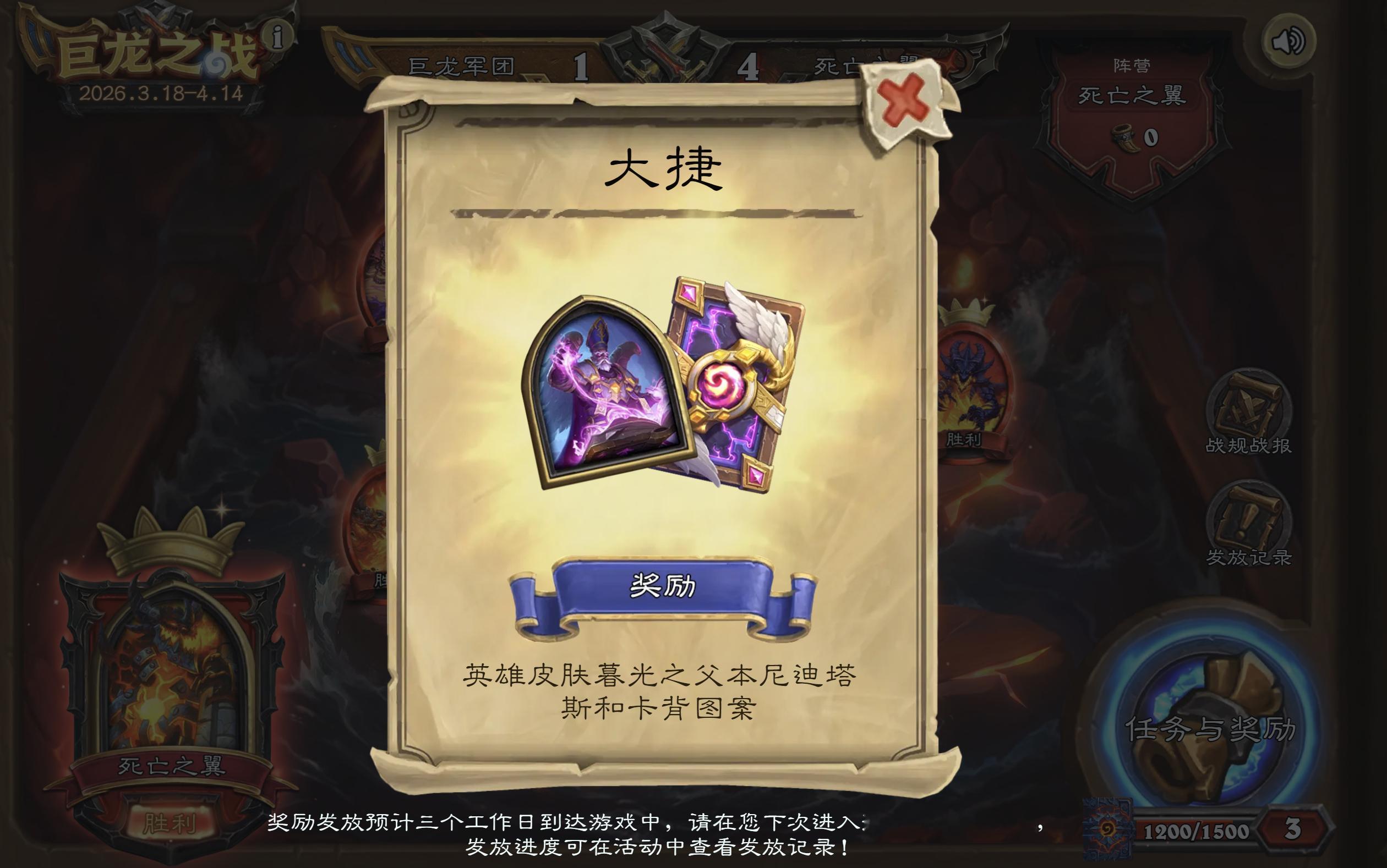 炉石传说 巨龙之战活动,最终死亡之翼阵营获胜,选择死亡之翼的玩家可以额外获得英雄