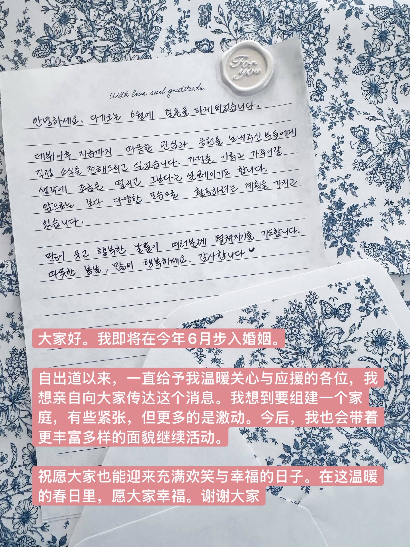 文彩元上传手写信,宣布今年6月结婚!欧尼要幸福啊!!!!!!!!