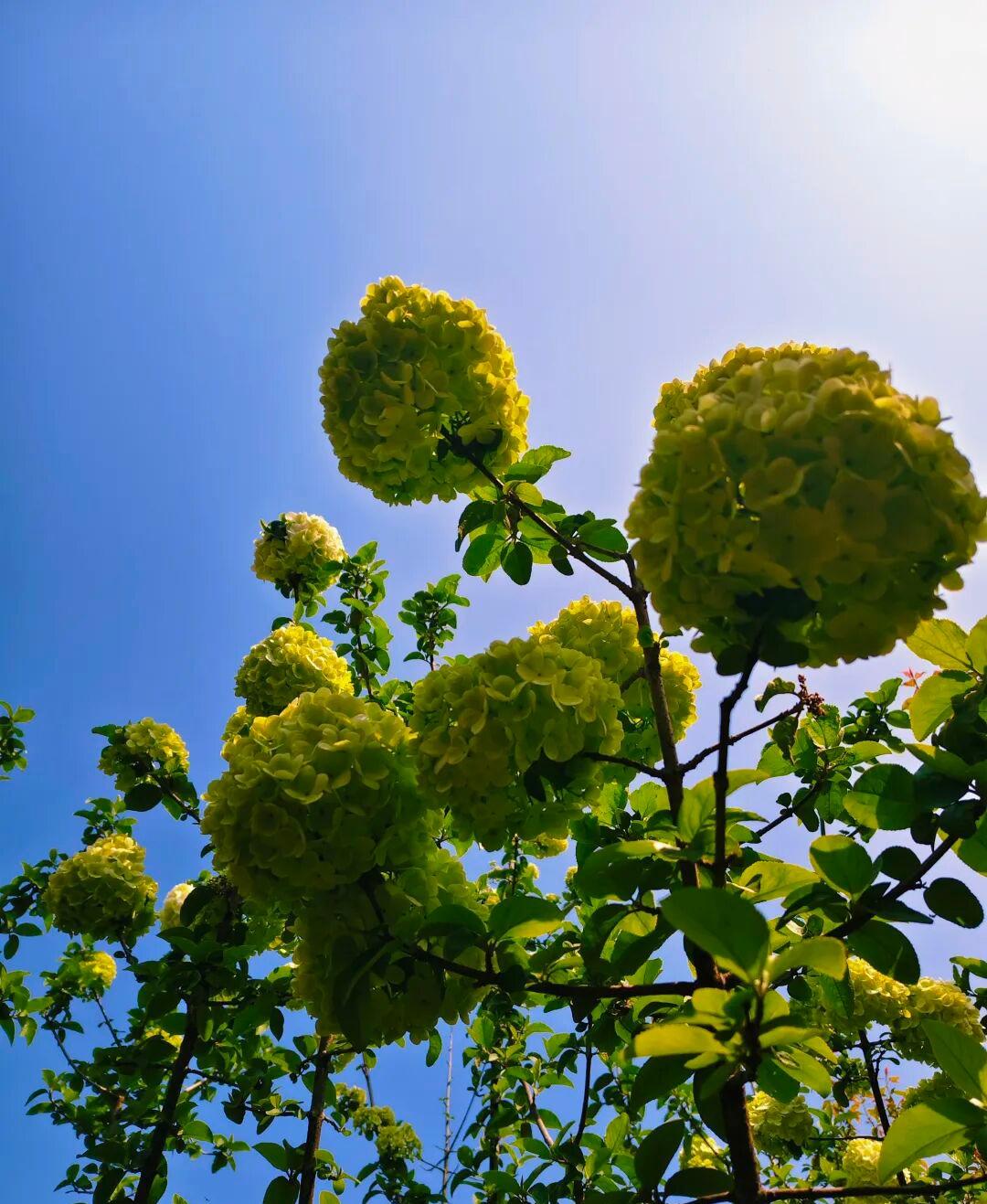 这团团的绿球,清新,通透,温润。我想,那颜色,恐怕再高超的画师,也调制不出;那花球,恐怕再手巧的工匠,也无法雕琢。它们在枝头,仿佛少女轻盈又美丽的绿衣。 青绿的花与叶,清新养眼静心 ,给人一种怡人怡心之感。