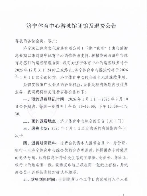 济宁珠江体育文化发展有限公司(下称"我司")衷心感谢您长期以来对济宁体育中心的信任与支持。根据我司与济宁市体育局签订的运营管理合同,我司对济宁体育中心的运营服务将于2025年12月31日24时正式终止。济宁体育中心游泳馆将于2026年1月1日起全面闭馆,济宁体育中心的会员卡无法继续使用。为切实保障广大会员的合法权益,妥善处理有效期内预付费业务,我司现将相关退费安排公告如下: