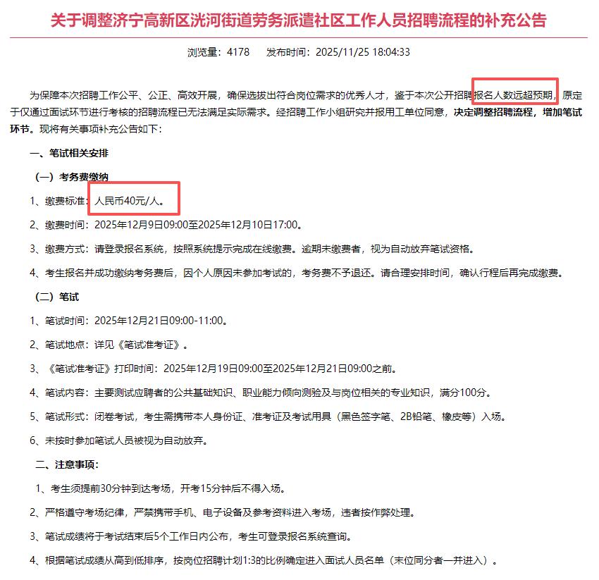 已经报名的济宁小伙伴注意了,因为此次网格员招聘报名人数远超预期,更改了招聘流程由原来的仅面试增加了笔试项目。大家一定要注意查看公告不要错过了,同时千万要记得在12月9号-10号登录系统进行缴费,如果不缴费就视为放弃。虽然40不多,估计不少人看到竞争这么大会选择放弃吧?