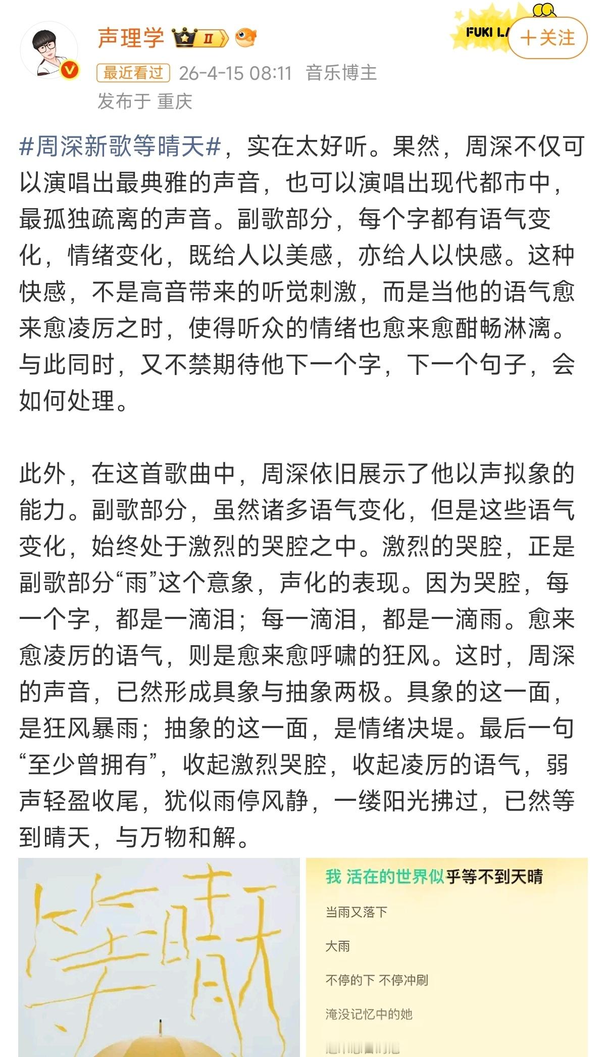 周深新歌被评以声拟象周深等晴天只有歌名是晴天周深新歌被评以声拟象,你也太会形容了吧 omg不过真的好听