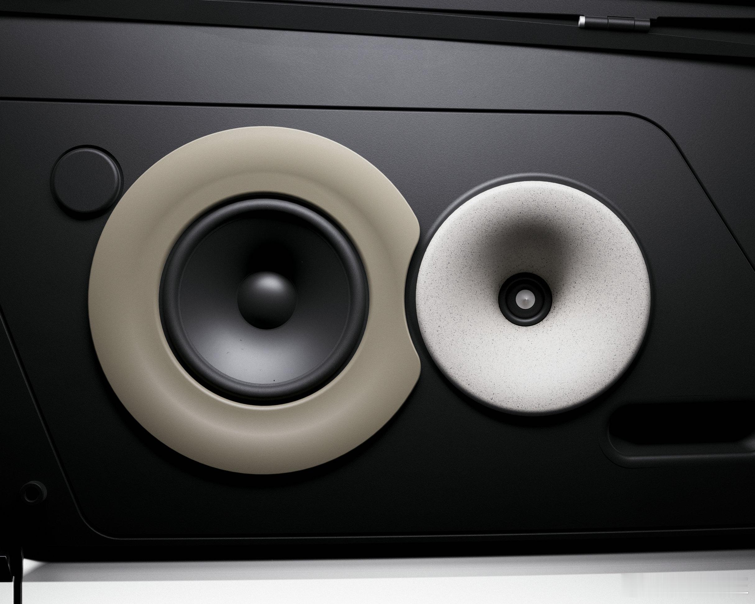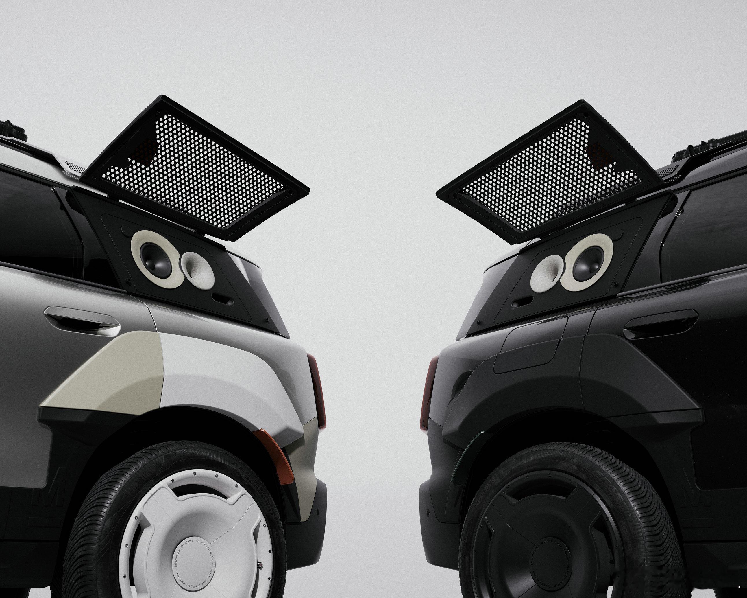 MINI COUNTRYMAN 与奥地利设计工作室Vagabund跨界合作的展车,设计师把整个后窗拿掉,换成了大功率音响,然后这种高功率的音响配合“铸造聚合物花岗岩”(cast polymer granite)的壳体,简单来说,就是花岗岩 + 石英 +玄武岩颗粒混合环氧树脂或者聚酯树脂浇注成型的一种复合材料,工程上它有一个更标准的名字——聚合物混凝土。这种材料的特性是密度高、刚性强,然后又不是很脆,所以能让箱体变稳,让音响的低频很干净。非常符合 Vagabund 那种“艺术+工程”的玩法