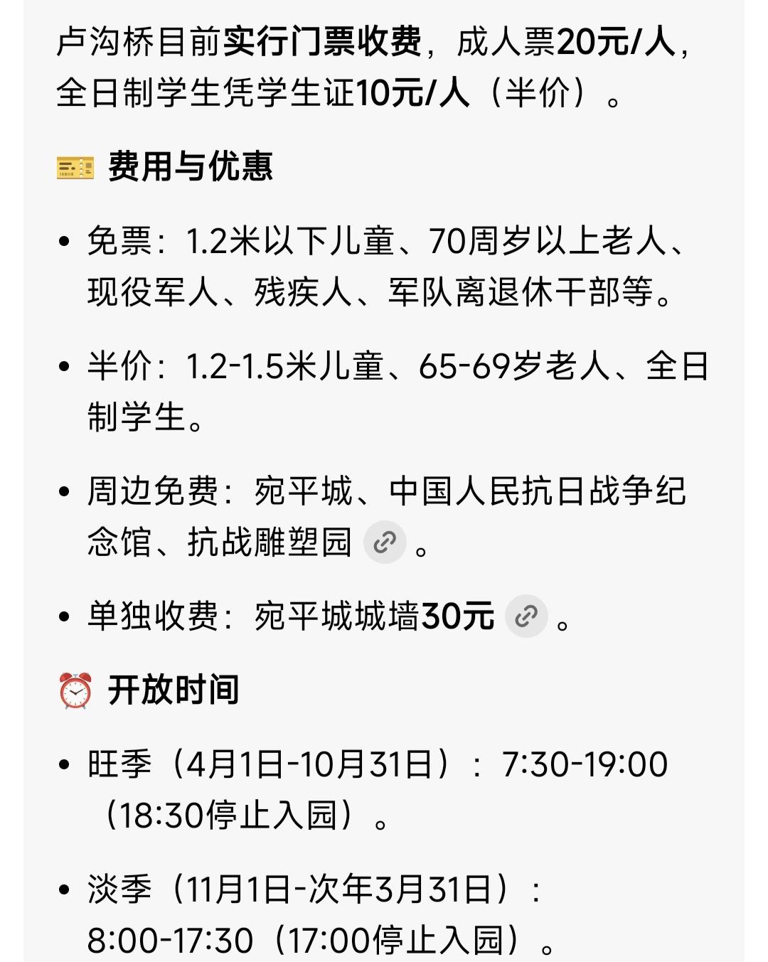 看到卢沟桥景区这几个字,很多人心里觉得挺难受。因为卢沟桥事变是日本全面侵华战争的开始,也是中华民族全面抗战的开始,它是一座具有特定历史意义的桥梁,勿忘国耻振兴中华,是这种桥赋予每个中国人的警示。而现在这座桥被围起来收费了,我是怎么都有点想不通。虽然周边的抗日战争纪念馆,宛平城等免费,但我就想说一句,我们真的缺那点钱吗?官方通报是收费维护桥梁增加旅游体验,可是卢沟桥就应该是爱国教育基地,不应该把它剥离开来收费旅游。如果确实存在维护费用不足,通报出来,我相信全国有很多人会积极捐款。成人每人20元,儿童每人10元,看似钱不多,但我相信去看的人会更少。旅行 头号创作者激励计划