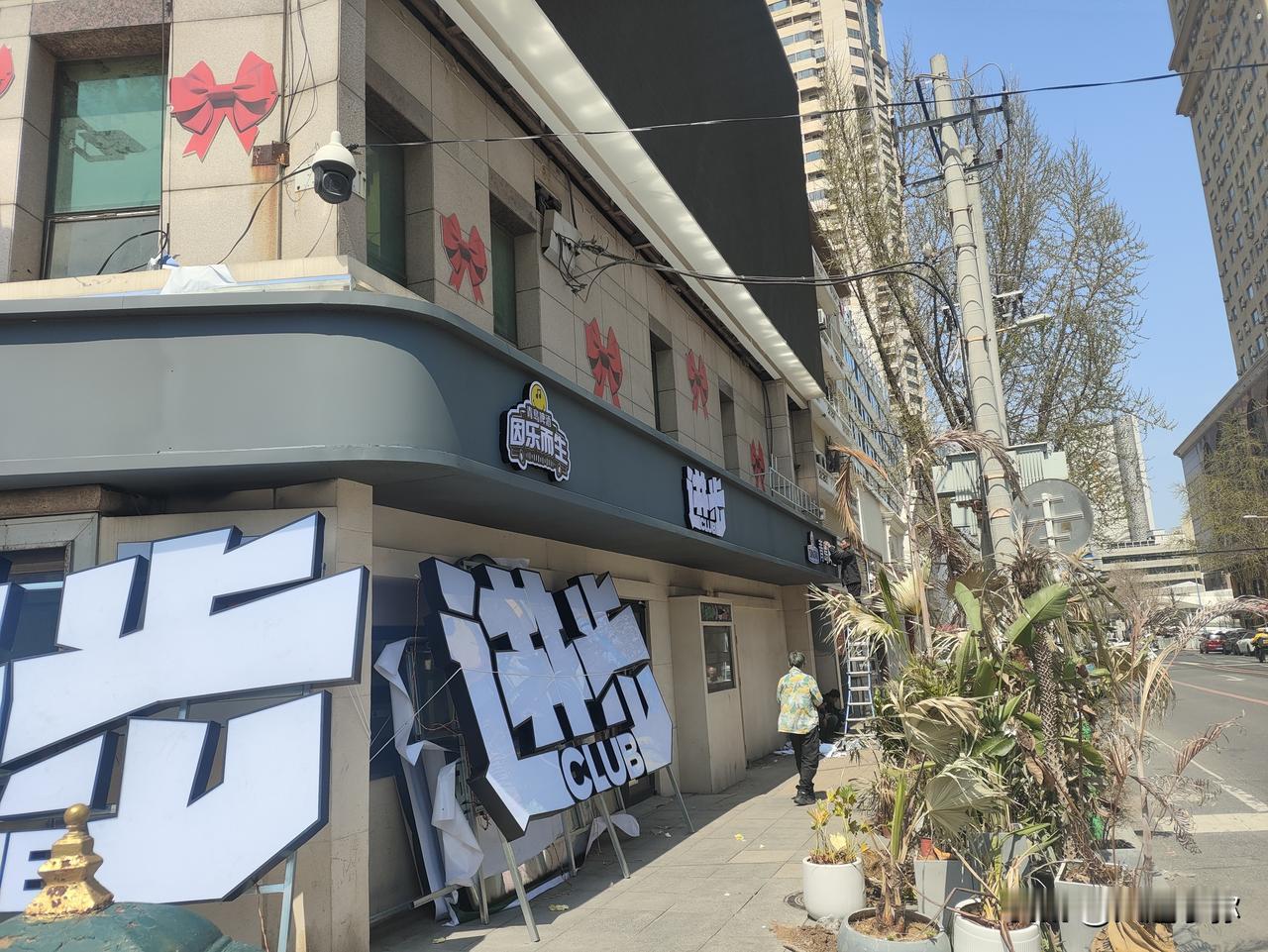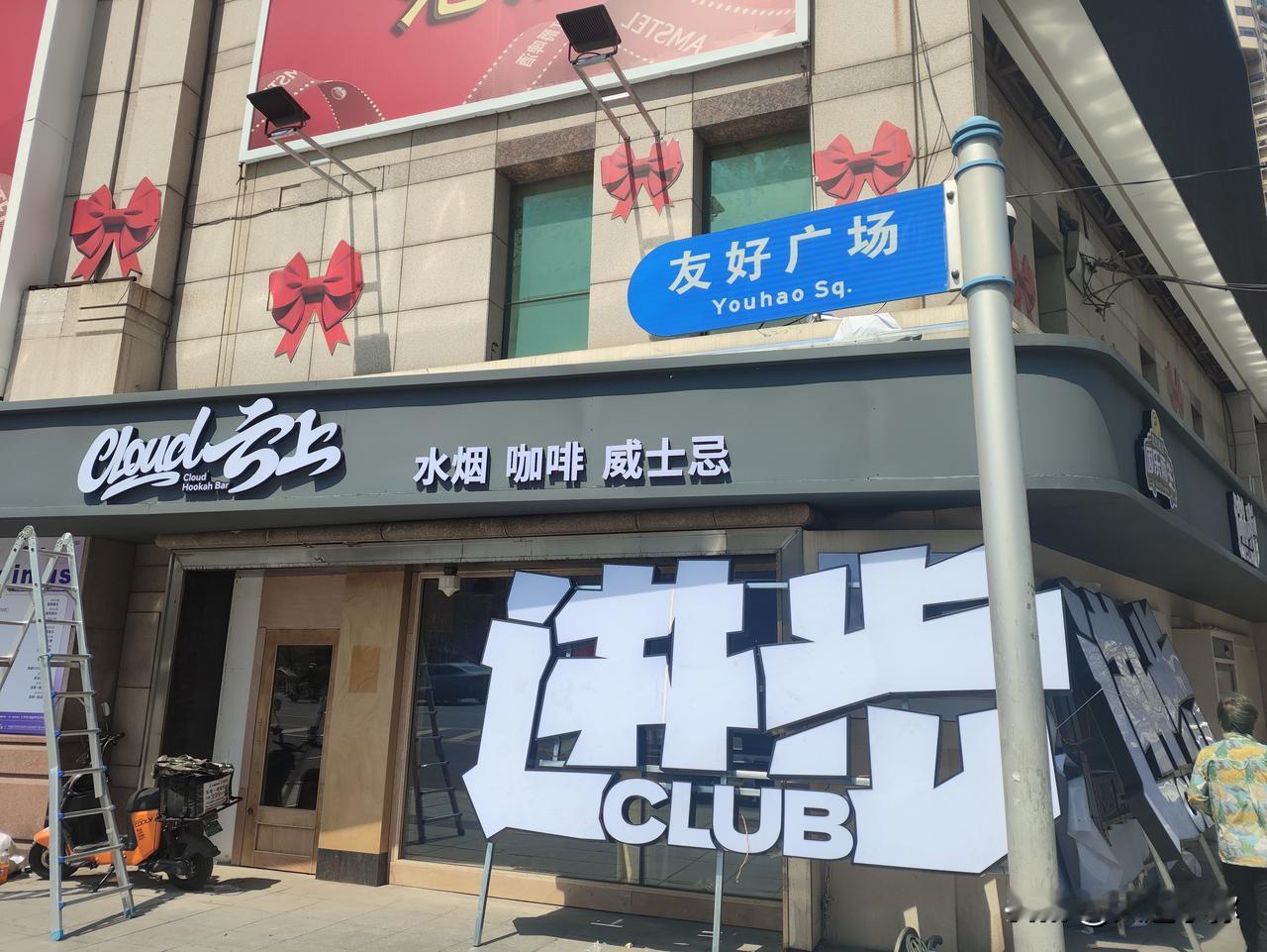 原歇业的进步咖啡馆重装,定名进步酒吧/俱乐部,工人正装招牌、赶内装。