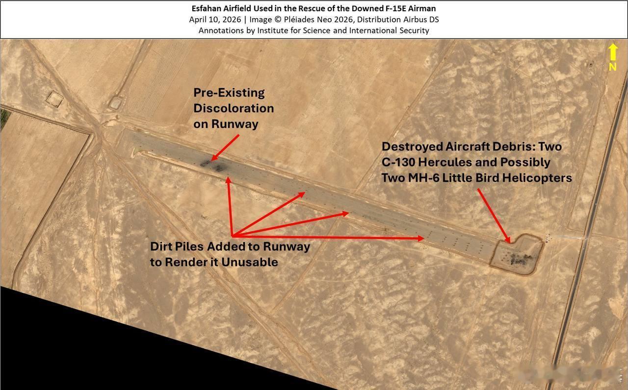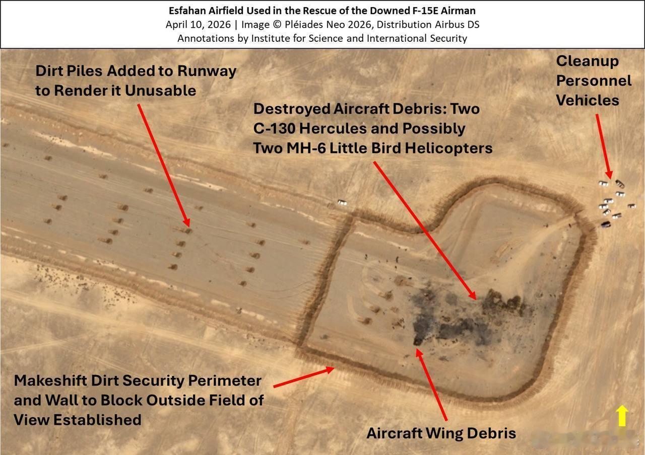 最新卫星图像显示,美军特种作战部队为营救被困伊朗的F-15E武器官而使用的简易机场,已被摧毁的两架MC-130J“突击队员II”运输机和两架MH-6小鸟直升机残骸清晰可见。