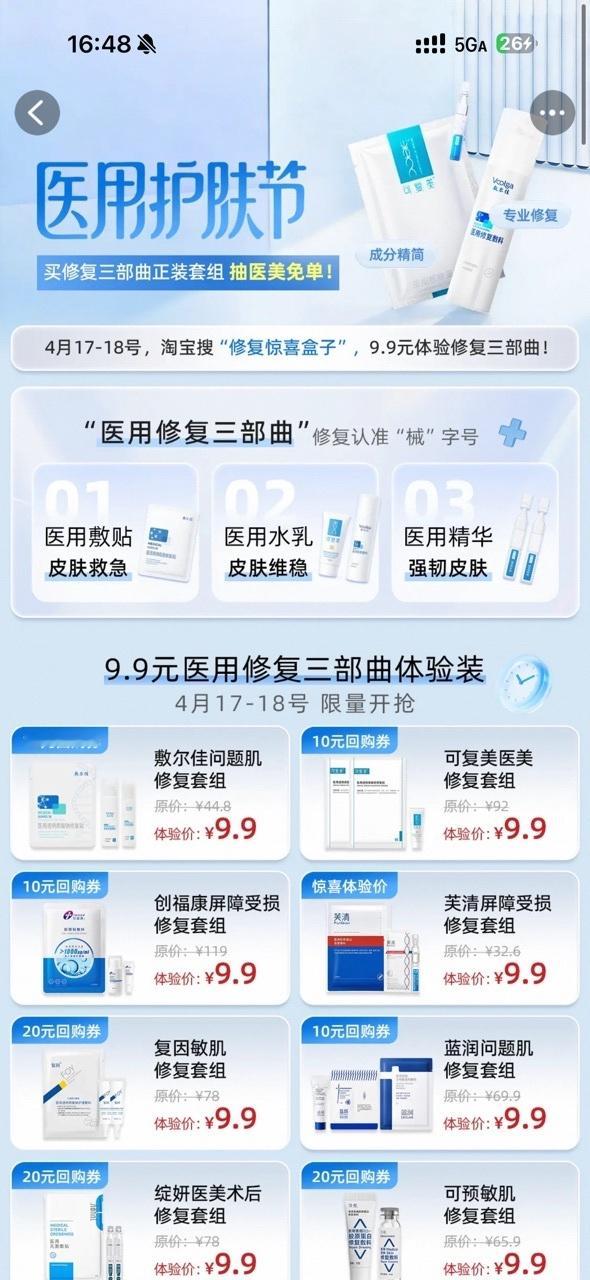 淘宝对天猫过敏 演我换季烂脸来了......几乎没有丝毫犹豫就去🍑宝搜“修复惊喜盒子”抢下了9.9元修复礼换季过敏修复全靠它了!不敢相信原价居然100+,而且买指定款送医美卡,之后两天概率还会翻倍,一直在going我啊啊啊,冲一个!