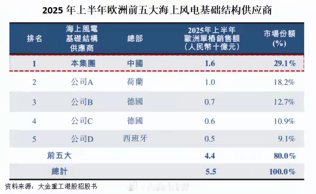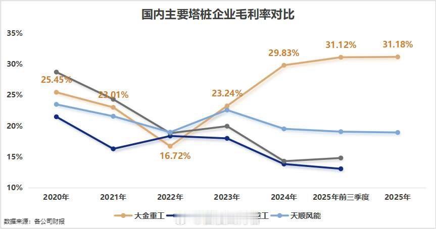 风电小巨人,砍下100亿订单!风电设备,在欧洲成了紧缺货。过去几年,欧洲各国纷纷上调海上风电装机目标。据预测,2030年欧洲海上风电新增装机量有望达到11.8W,2024-2030年年复合增速高达27.9%。然而,本土供应链却因为产能不足、交付周期长,难以跟上节奏。这为我国风电企业带来了机遇。大金重工,等到了这场东风。2025年,大金重工的海外收入从上一年的17.33亿元飙升至45.97亿元,收入占比从45.85%上升至74.46%。可以说,大金重工在2025年变成了一家以海外业务为主导的公司。那么,大金重工是如何做到逆风出海的?机会,总是留给有准备的人。大金重工的主要产品是风电塔桩,早在2019年就成功开拓了欧洲市场,是亚太地区唯一为欧洲批量交付海风单桩的企业。经过几年的积累,大金重工在欧洲市场也算是创出了一片天地。公司港股招股书显示,2025年上半年,公司在欧洲海风基础市场份额达到了29.1%,较2024年提升了10个百分点,跃居行业首位。根据年报披露,截至2025年末,公司在手的海外订单超过100亿元,主要集中于未来两年交付,覆盖欧洲北海、波罗的海等多个海上风电项目。那么,是什么让欧洲开发商愿意把订单交给大金重工?欧洲海上风电市场更加看重交付能力,行业普遍秉持“保交付优先于保价格”的理念。大金重工正是抓住了这一点,实现了对客户的快速响应。2024年下半年,大金重工正式启用DAP一站交付模式,也就是将货物直接运送至客户指定的所在地,这意味着从生产制造、物流运输到最终交付的全流程都由公司统一负责,能够为客户省去诸多环节的麻烦。简单来说,就是大金重工不仅卖产品,还提供送货上门安装服务。这时,“运输+安装”的自主可控成为重中之重。1.自建海工装备运输船。由于海工装备体积大、重量大,运输难度较大,需要采用特种船舶,还要熟练掌握船舶配载、浮托安装等技术。因此,大金重工直接业务延伸至船舶制造,自行运输。2023年,公司投运辽宁盘锦造船基地,填补了这一缺口。2025年10月,大金重工首制4万吨甲板运输船在公司盘锦造船基地顺利下水,并在2026年2月启动首航任务。2025年,公司资本开支达到了21.99亿元,同比增加160.24%。主要原因就是公司盘锦船舶项目投入加大。不仅如此,大金重工造的船舶还在对外出售。年报显示,公司在2025年分别与韩国和挪威船东签订了造船订单,合计金额5.85亿元,均在2027年交付。4月13日,大金重工发布消息,称与正力海洋工程有限公司正式签署欧洲市场风电安装船业务战略合作框架协议,进一步布局欧洲市场。通过自建运输船队并对外销售船舶,大金重工不仅确保了自身风电产品出口的交付效率,还凭借在船舶制造领域的技术积累和产能优势,将其打造成新的业绩增长引擎。2.布局码头资源。截至2025年末,大金重工分别在丹麦、德国、西班牙布局了码头资源,紧密围绕欧洲波罗的海、北海、大西洋沿岸等核心区域,构建起覆盖欧洲主要海上风电市场的本地化交付网络,提升交付能力。海外业务的放量,也给大金重工带来了一定优势。一个是毛利率提升。海外市场,尤其是欧洲市场,认证标准严、技术规格高,因此附加值更高。拿大金重工为例,2025年,公司海外收入的毛利率为33.95%,而国内收入的毛利率为23.13%,两者相差超过10个百分点。近年来,国内风电行业招标价格低迷,塔桩企业的盈利能力自然受到挤压。例如,泰胜风能、天能重工、天顺风能的毛利率均出现不同程度的下降。但大金重工凭借出海,成功穿越周期。如下图所示,2022年大金重工的毛利率仅为16.72%,为四家企业中最低。但到了2023年,大金重工的海外业务开始放量,毛利率迅速上升至23.24%,一举超过其余三家。2025年,公司毛利率进一步上升至31.18%,与国内竞争对手拉开了差距。同时,公司的业绩也迎来回暖。2025年,公司实现营收61.74亿元,同比增长63.34%;净利润11.03亿元,同比增长132.82%,足足翻了一倍。另一个是回款变好。一般来说,随着营收的上升,公司的应收账款规模也会相应增加。由于海外客户的回款意愿较强,大金重工的应收账款出现了下降。2024-2025年,大金重工的营收增速超过60%,但应收账款从13.1亿元下降至10.57亿元。同时,公司的周转速度也在加快。2023-2024年,大金重工的应收账款周转天数在140天左右,但到了2025年,这一数值迅速降至69天。这说明,公司的回款能力在增强。大金重工凭借先发优势、强大的交付能力,成功抓住了欧洲海上风电快速发展的机遇。公司实现了海外业务的爆发式增长,成功穿越了国内风电行业的周期波动。未来,随着欧洲海上风电装机目标的持续提升,大金重工有望在全球海上风电市场中扮演更加重要的角色。