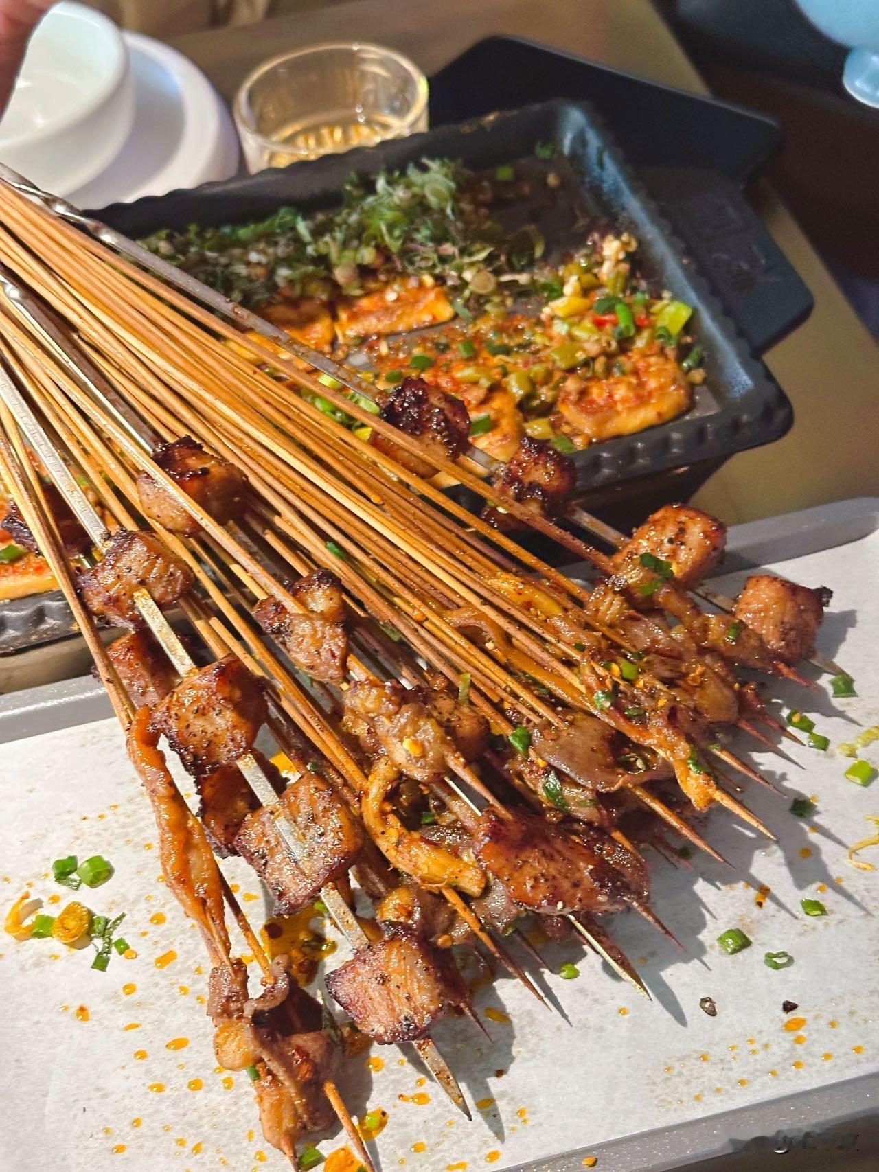 招牌麻辣烤鱼真香!皮脆肉嫩麻辣鲜香,太够味了!黑豆花很出彩,莴笋土豆豆干都超级入味,越吃越香。宵夜之神宜宾把把烧一定要点!吃起来就像开盲盒一样,鸡胗,肥肠,鸡脆骨五花肉~先卤再烤脆嫩入味,撸不够完全撸不够!