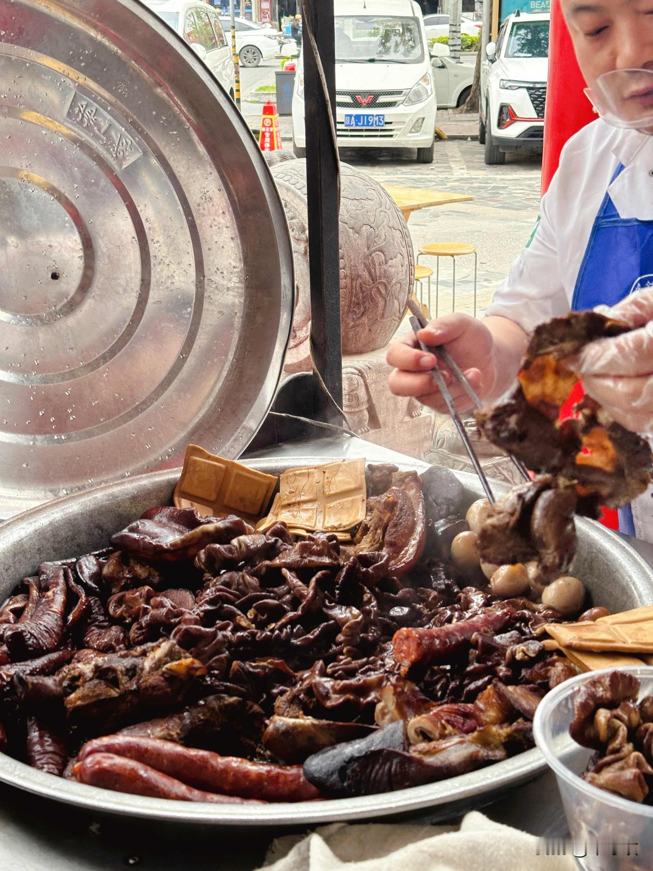 店门口支了一口大锅,锅盖一掀香气四溢。梆梆肉熏制的恰当好处,软烂入味,护心肉,香肠,猪肝豆干,鸡蛋随便拼一盘下酒懂得都懂[点赞]
