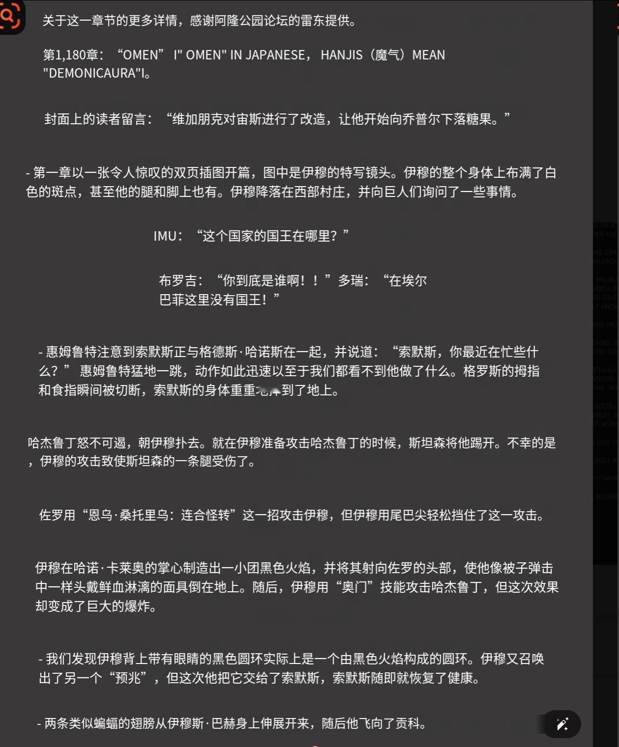 海贼王1180话的文字情报,[震惊]图里的中文是用ai翻译的,外语好的小伙伴可以直接看原文。伊姆出现在巨人国后询问这里的国王是谁,然后对众人展开了凌厉的攻势,海尔丁的巨人海贼人一下子有两位巨人分别被砍了手指和脚,海贼王里面很少有人直接死亡,可以说是最高伤害的表现了。[震惊]