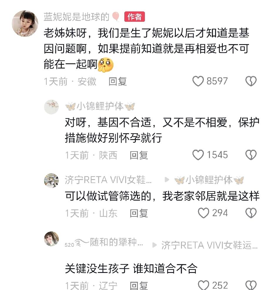 有人说结婚不能选同村的,同村的很有可能是同祖宗,有相似基因,同镇的也要考虑,蓝妮妮的父母又是同村的,两个人称如果结婚前知道两个人的基因相冲,就是再相爱也不会结婚的,但是即然有了妮妮,就要把日子好好过下去,给妮妮一个完整的家。
