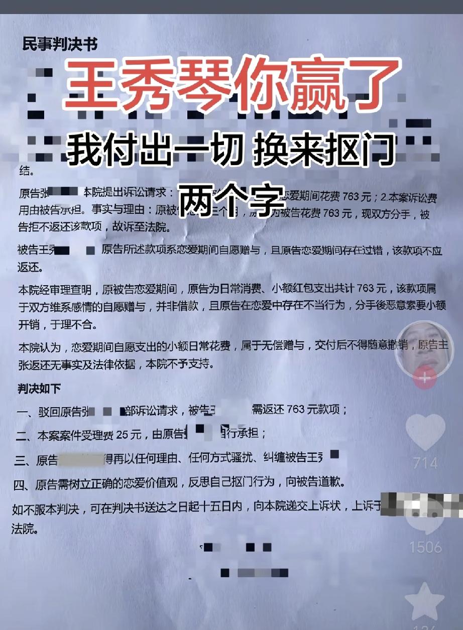 笑死了,男人上法院起诉前女友,要求前女友返还恋爱期间前女友花费的763元,被法院