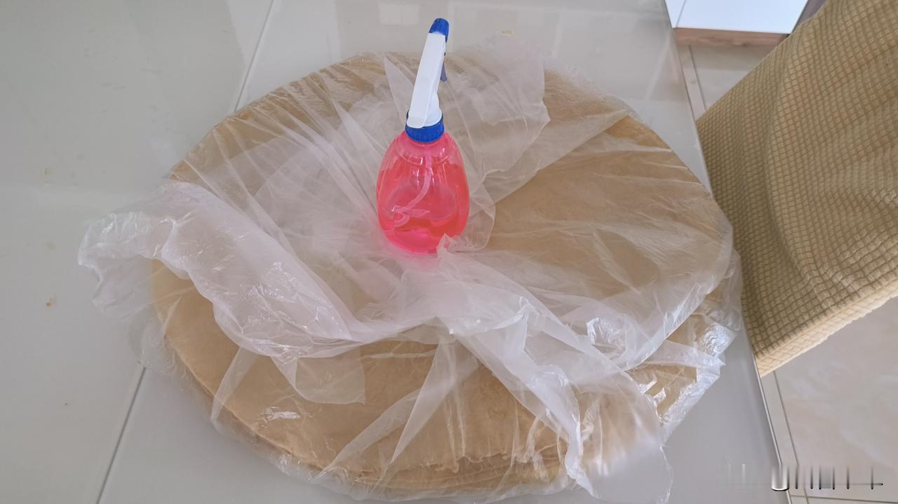 先在桌上铺好薄膜,把要渗的煎饼置于薄膜中央,拿起喷壶在煎饼上均匀喷上一层水雾,喷完一张,就盖上一张,接着再喷,如此将所有煎饼依次喷完。