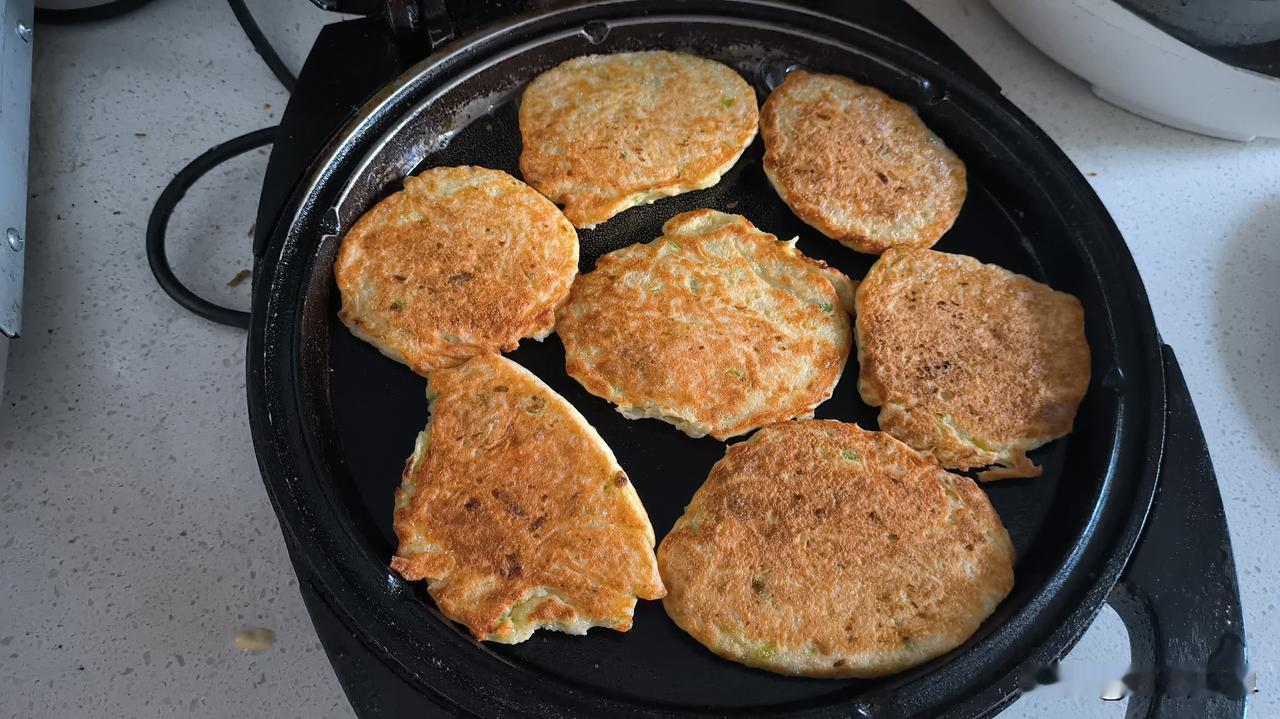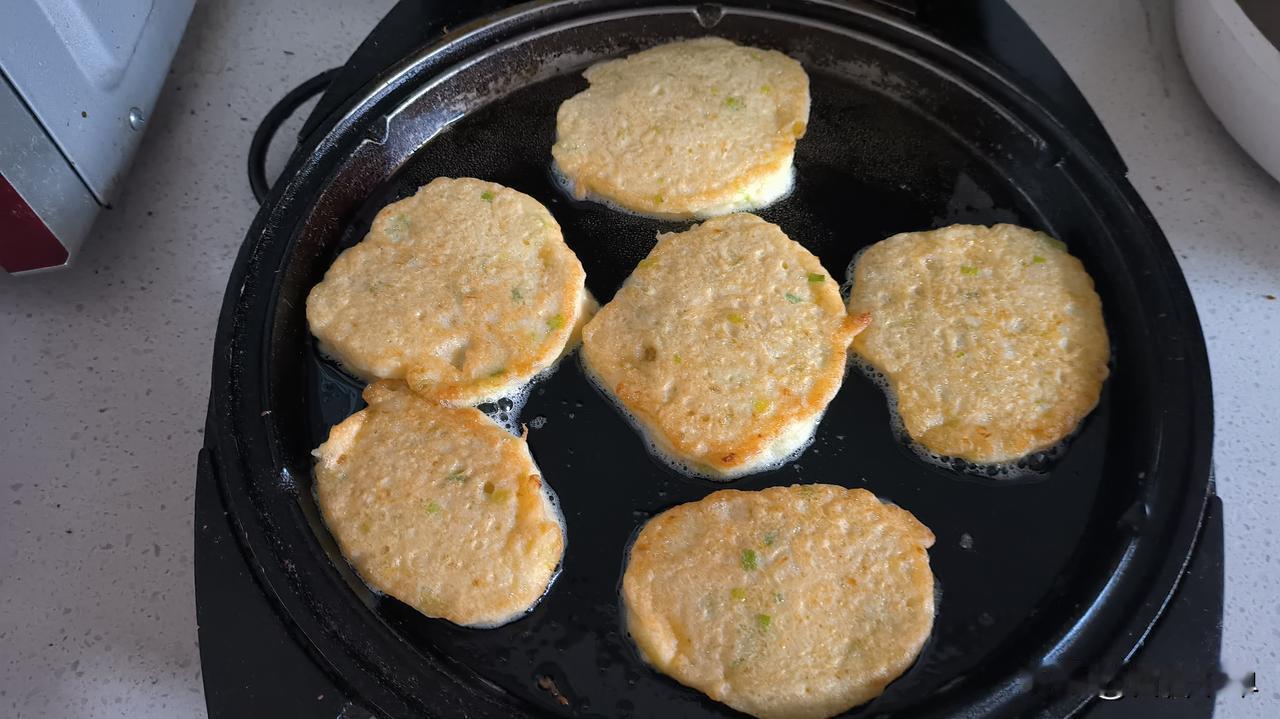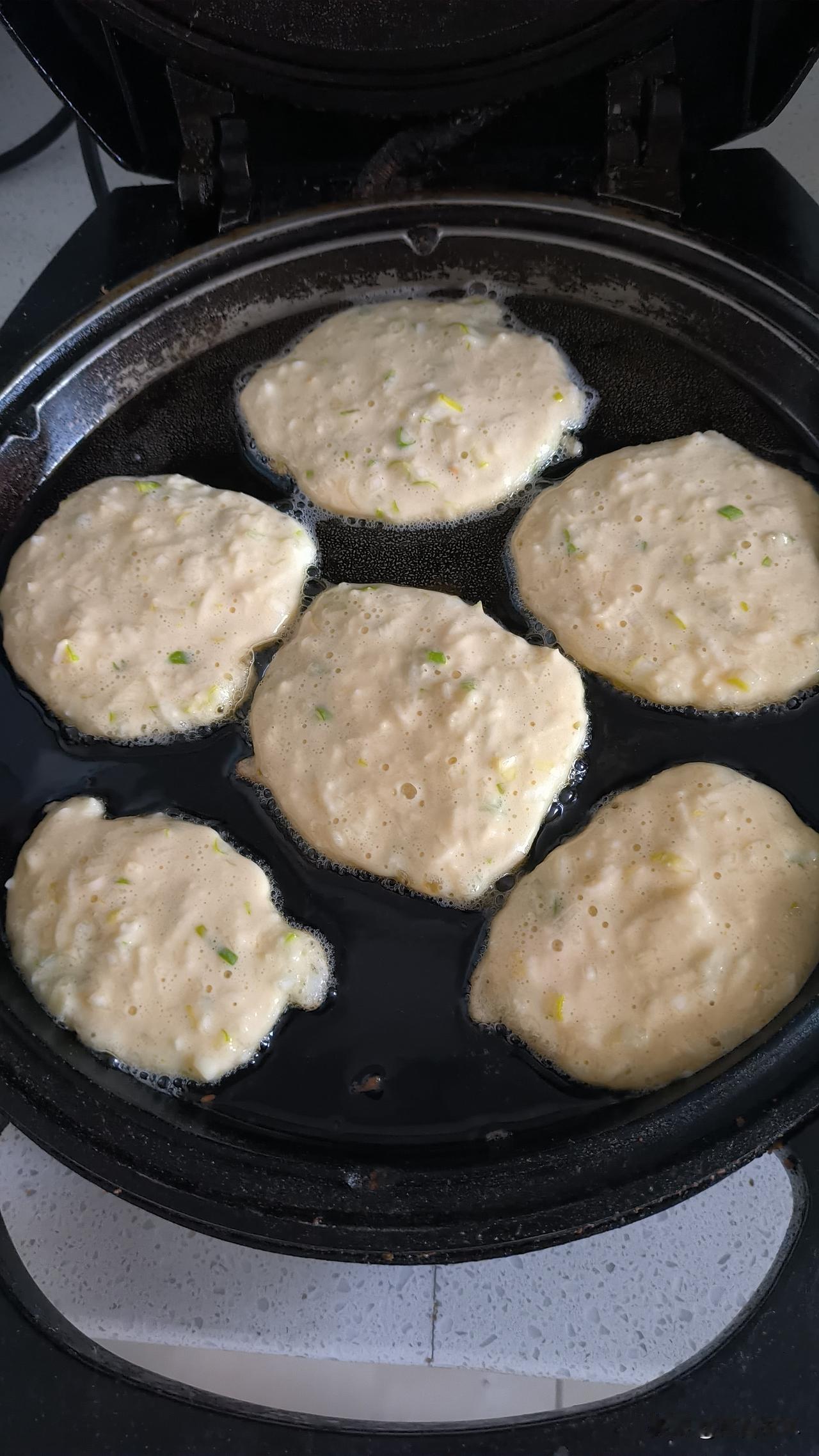 盖上盖子继续加热,当两个灯有一个熄灭时,给饼翻面,再次盖上盖子。等两个灯都熄灭,就可以起锅了,此时两面金黄的山药鸡蛋香葱饼便大功告成。