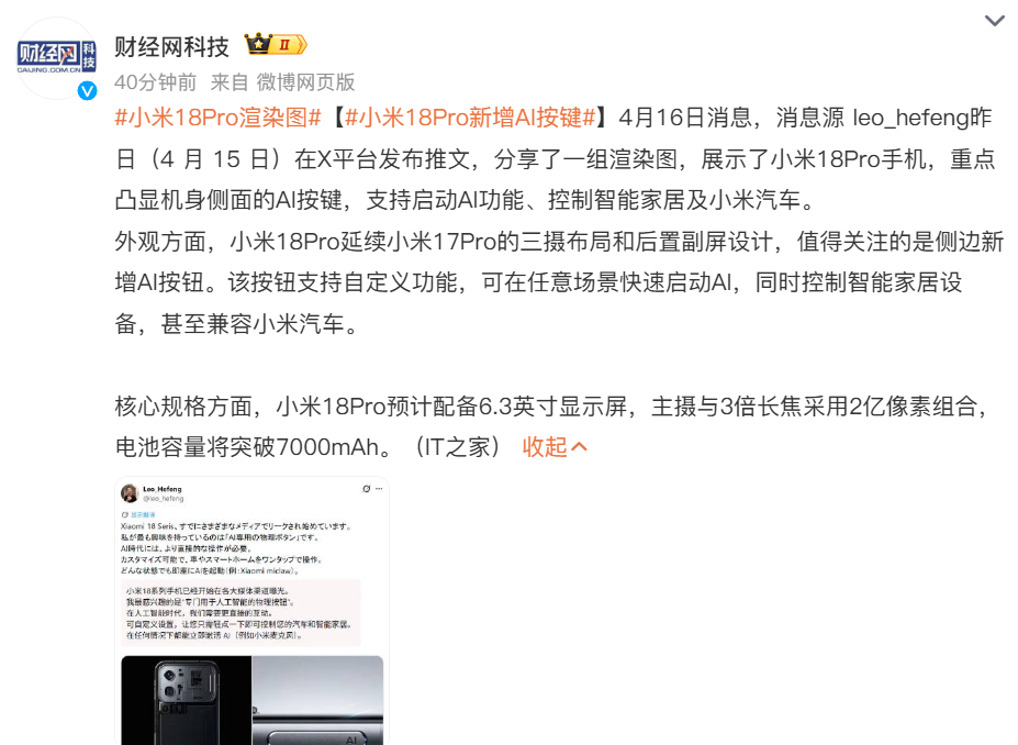 小米18Pro新增AI按键 说爆料加了AI按键~ 为啥感觉不太可信呢?