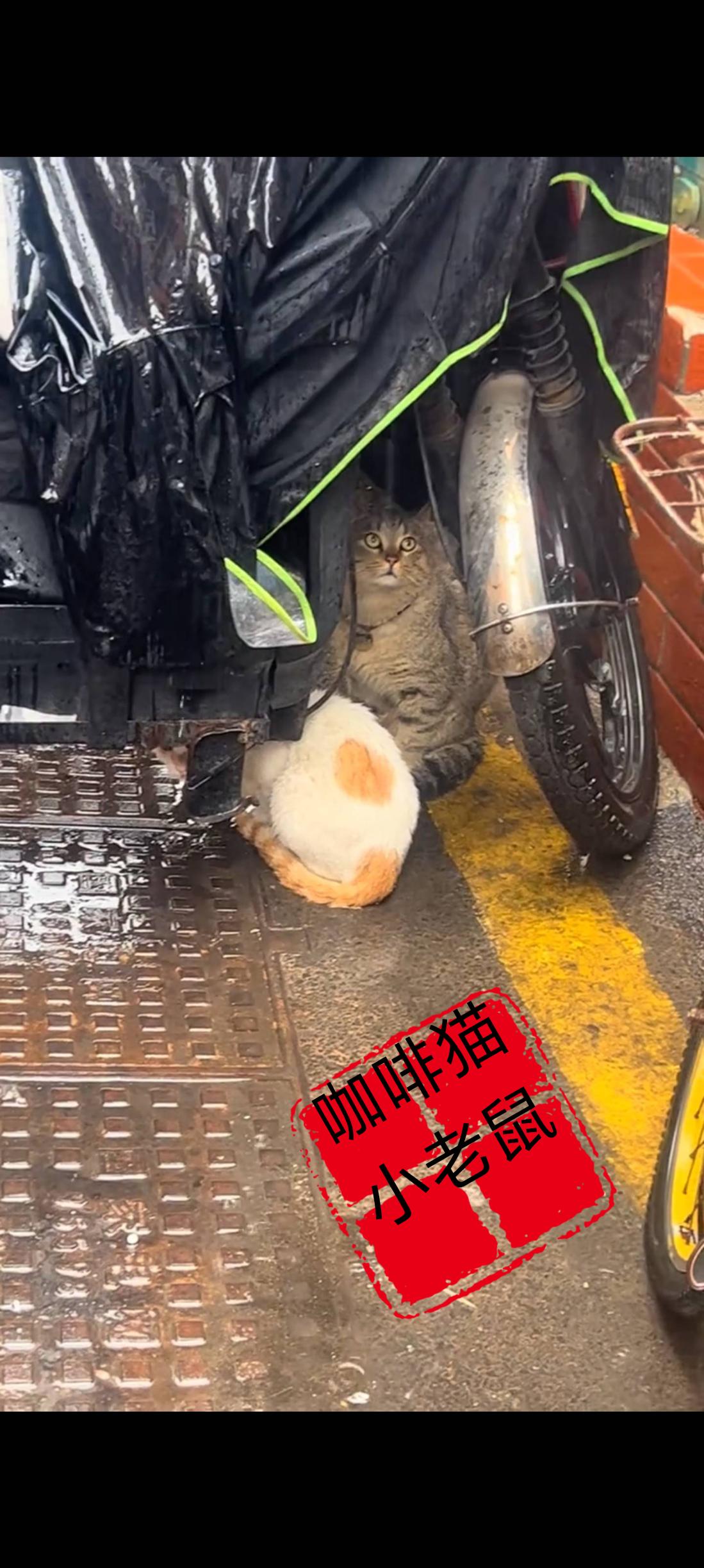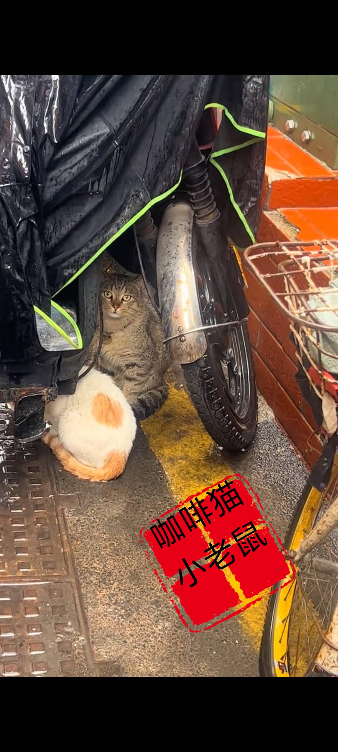 两只无家可归的流浪猫,为了躲避极端的暴雨天气,竟然相互依偎在了一起,躲藏到了一辆电动车的底下进行临时避雨!
