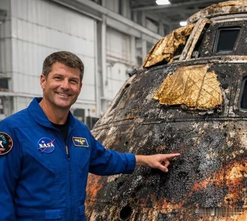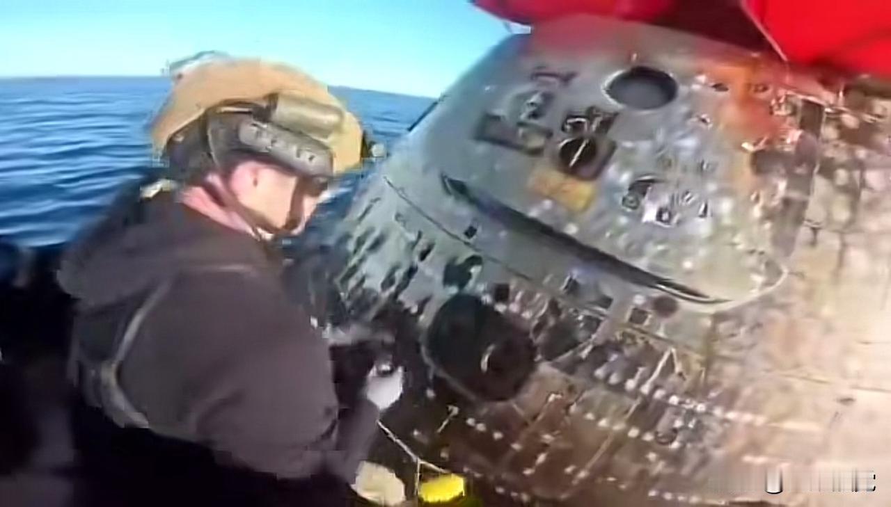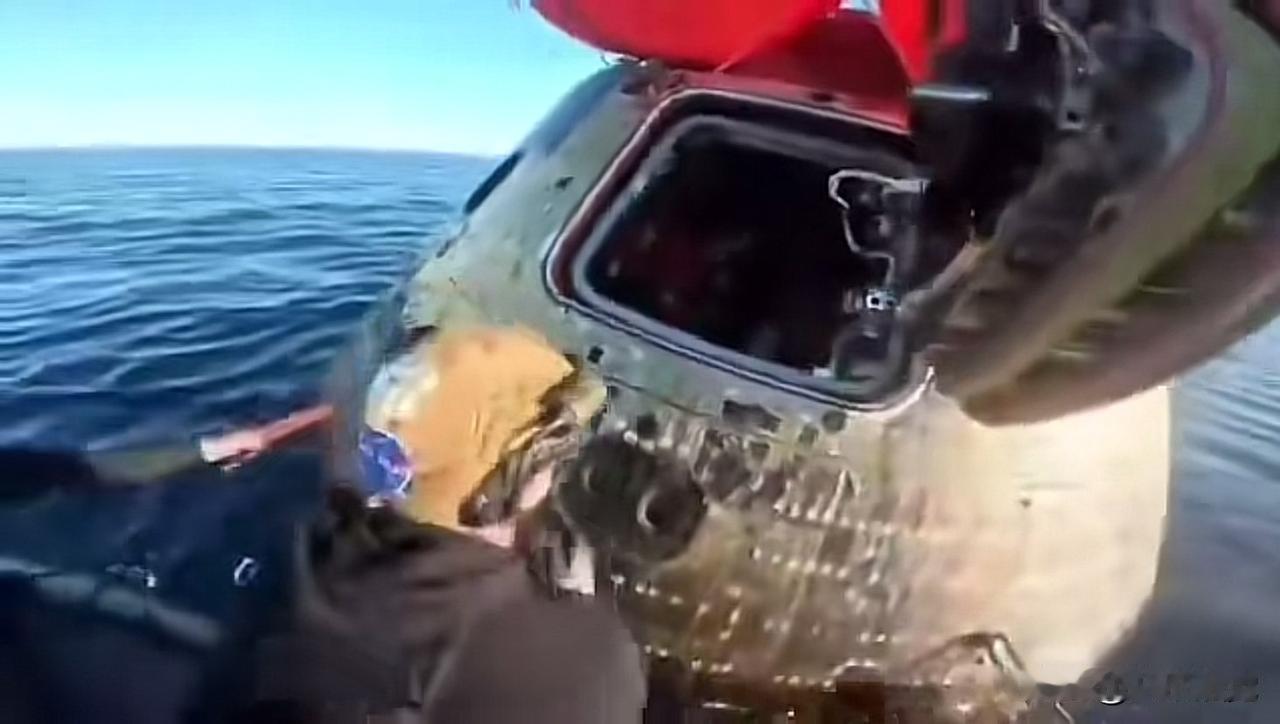 猎户座飞船返回舱。这抗烧蚀能力真厉害啊!银白色隔热层有明显的局部脱落及发黑,但高