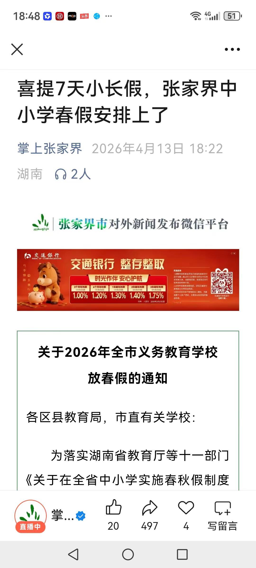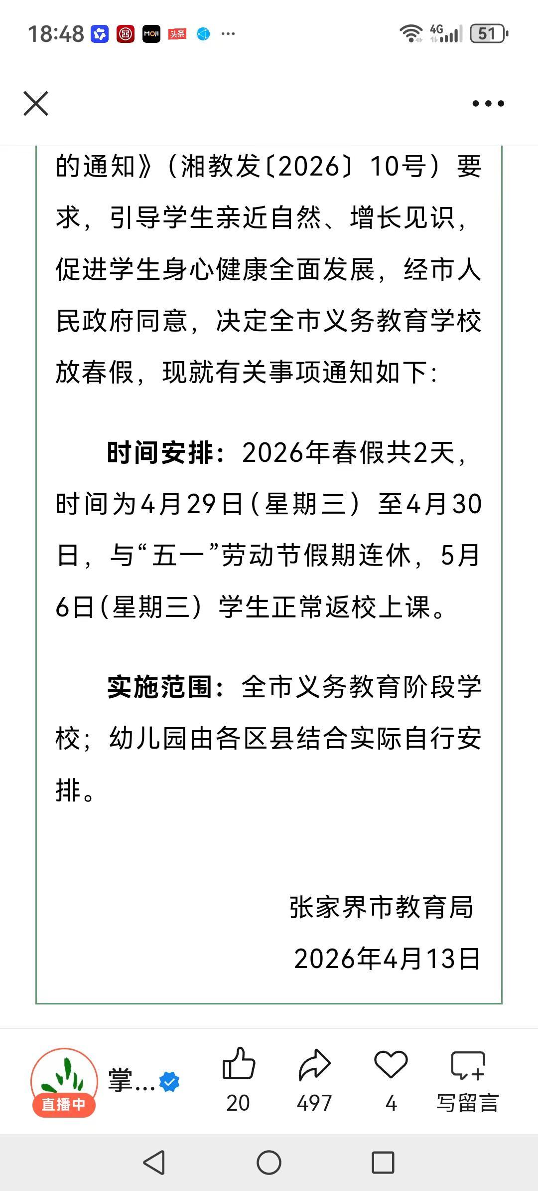 张家界中小学放春假喽!上热门