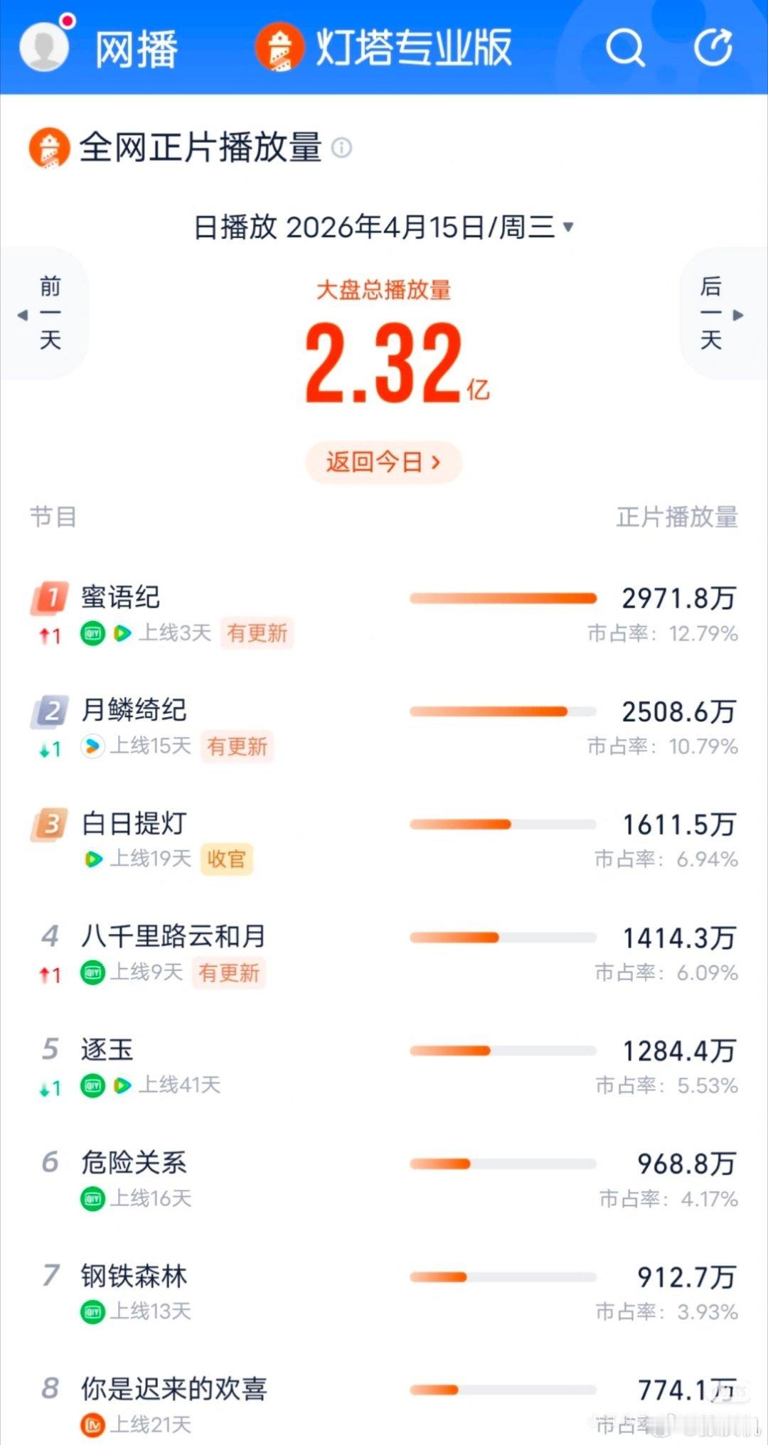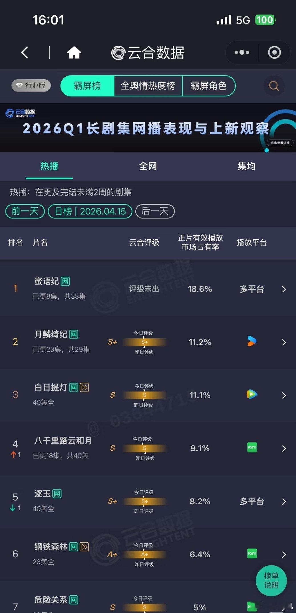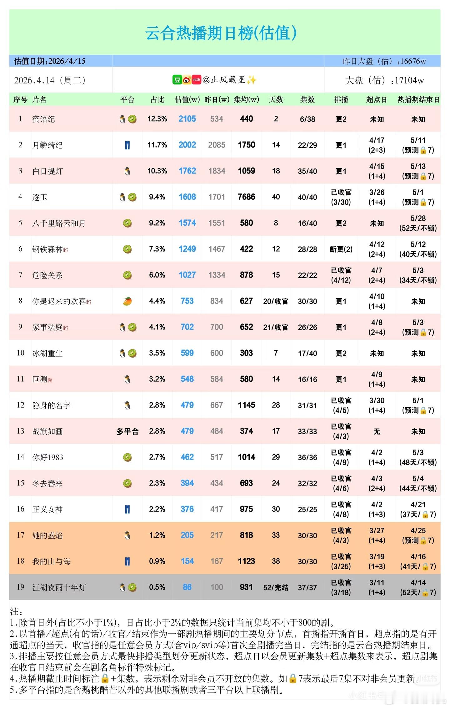 《月鳞绮纪》目前横盘,看明天周五能否重回3000+!《白日提灯》收官了,平开平走!《八千里路云和月》又上升一位,这部剧质量可以,可惜没热度!《逐玉》还在千位!前十剩余都是完结剧,除了一个《冰湖重生》,扑到不行!