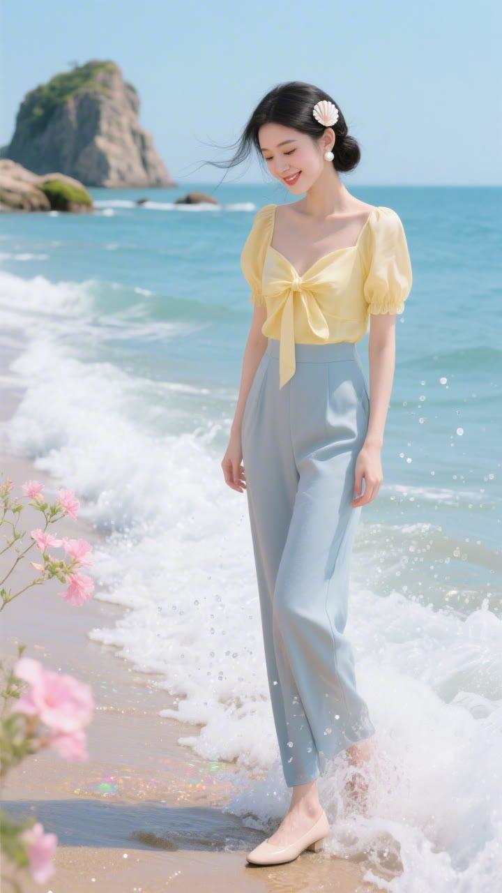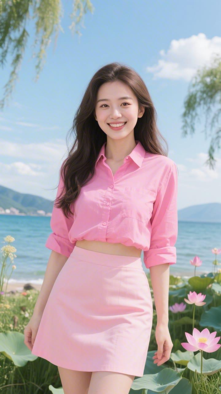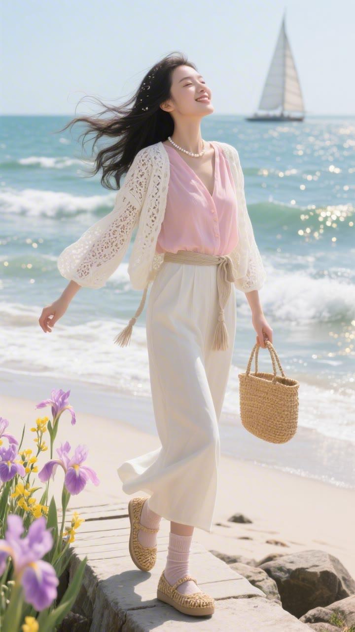 海边少女,粉嫩梦幻,花环点缀,笑靥如花